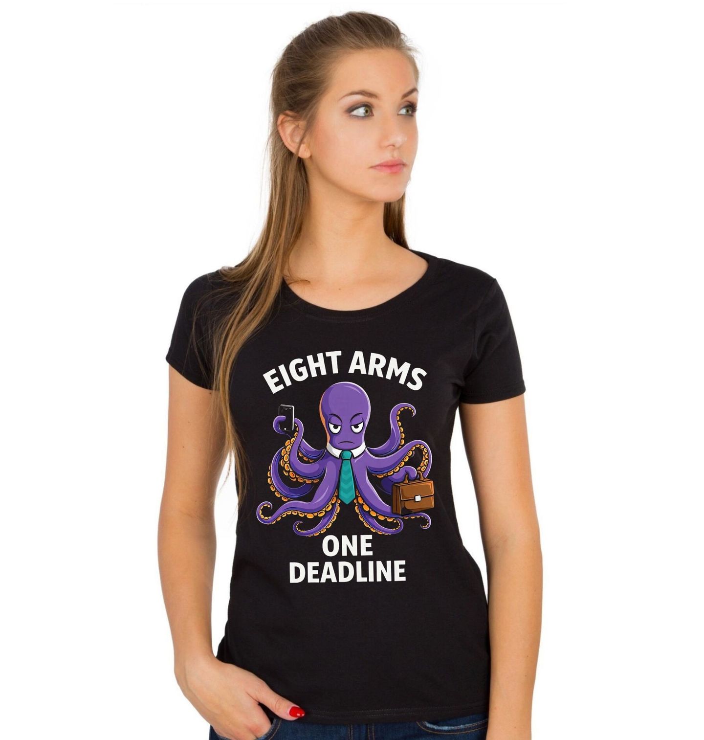 Dámské tričko Chapadla Plné Práce. Vtipný motiv, kde chobotnice v elegantním stylu zvládá multitasking. Její chapadla drží telefon i kufr a doplňuje ji stylová kravata. Design vystihuje pracovní shon i humor každodenních povinností. Text na obrázku „EIGHT ARMS ONE DEADLINE“ znamená „Osm chapadel, jeden termín“.