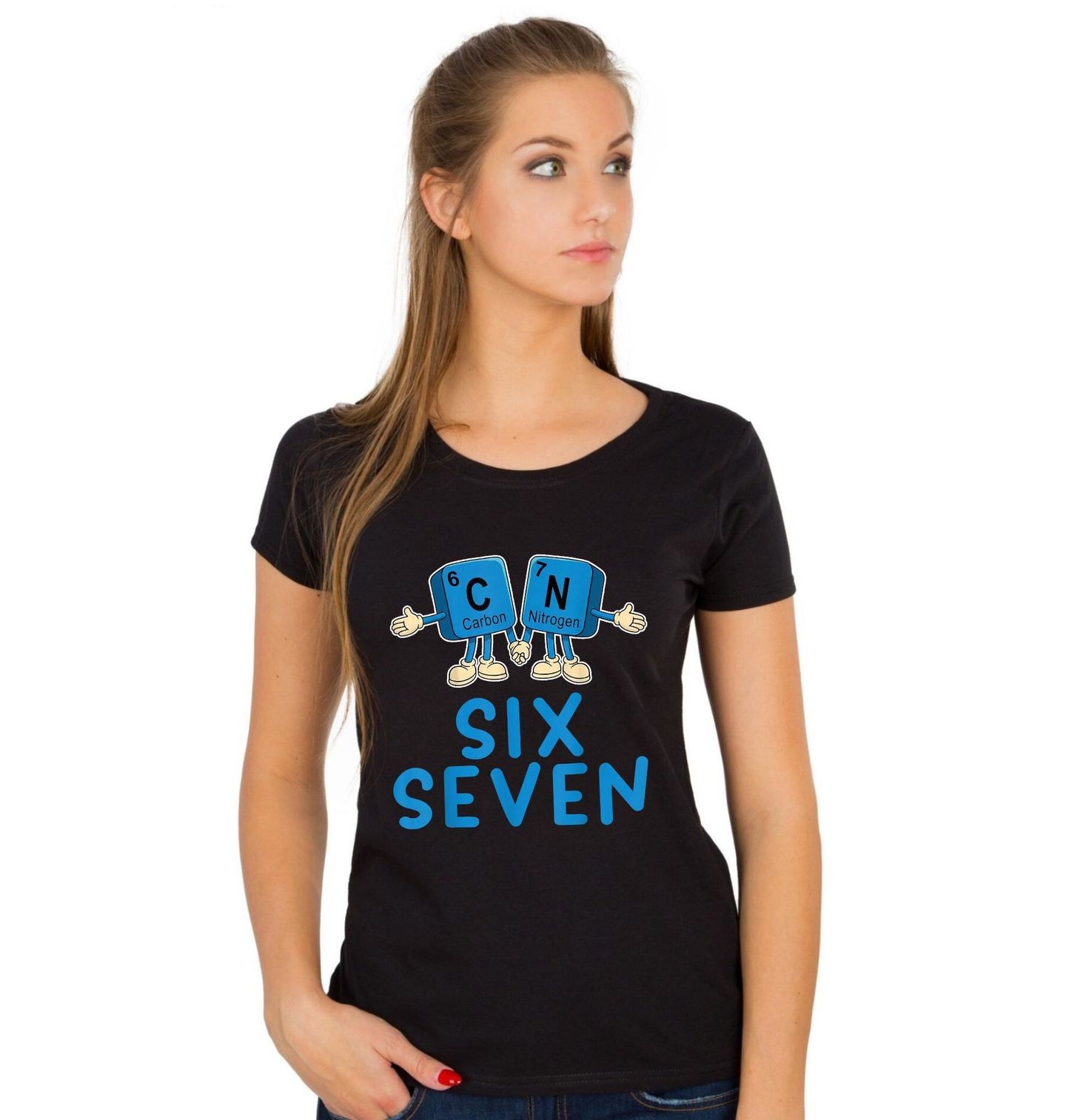 Dámské tričko Chemické prvky 67 Six Seven. Originální chemický motiv 67 ve stylu six seven meme pro všechny milovníky vědy, humoru i tabulky prvků. Vtipná ilustrace zobrazuje dva prvky z periodické tabulky – uhlík (Carbon, číslo 6) a dusík (Nitrogen, číslo 7) – jako kamarády držící se za ruce. Ideální dárek pro studenty, učitele, chemiky i geeky, kteří milují chemie a chtějí to dát stylově najevo.