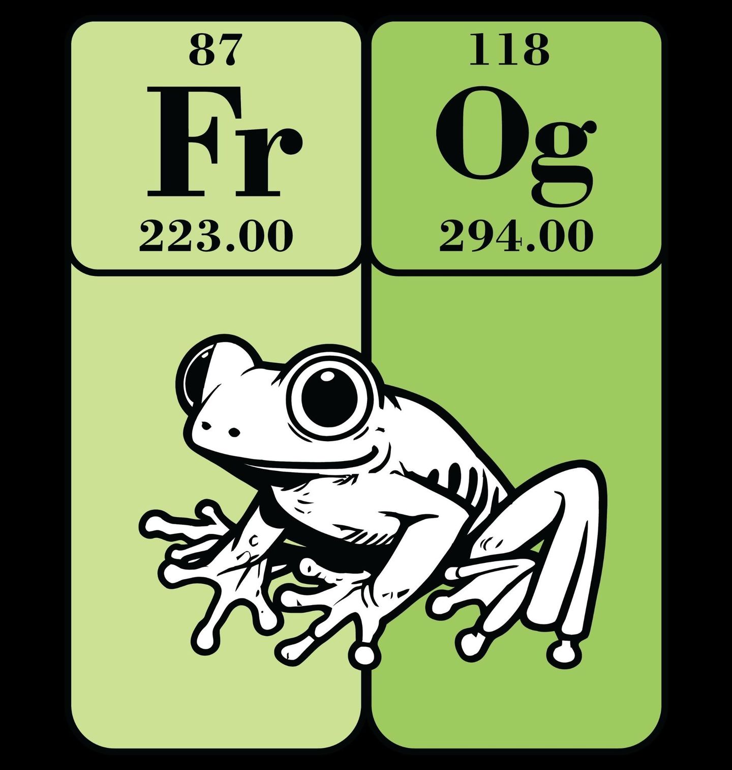 Dámské tričko Chemické prvky Žába FrOg. Vtipný a kreativní motiv inspirovaný periodickou tabulkou prvků zobrazuje nápisy „Fr“ a „Og“ spolu s číselnými hodnotami a ilustrací žáby, čímž vzniká slovo „Frog“ (žába). Design si pohrává s vědeckým stylem a převádí ho do humorné podoby. Zobrazené prvky připomínají skutečné chemické značení, což ocení zejména studenti, učitelé nebo fanoušci vědy.