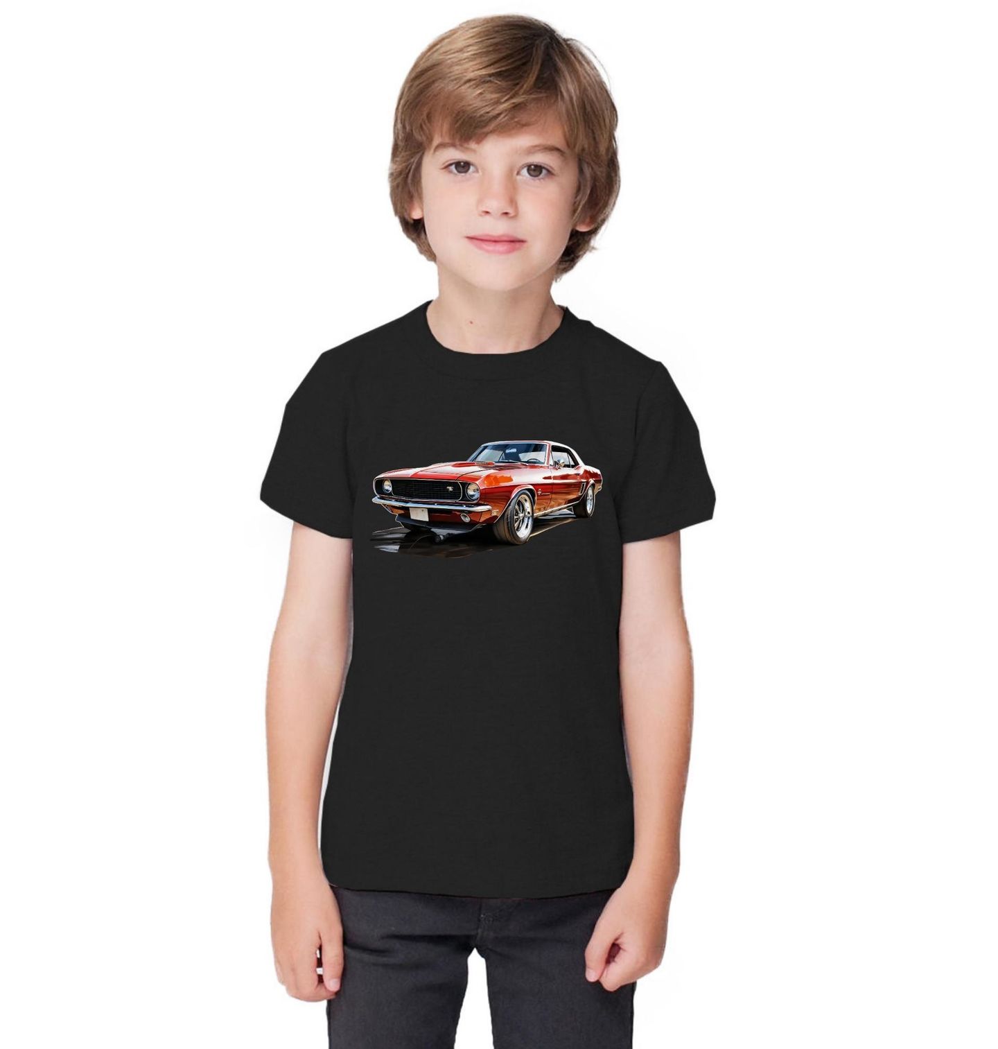 Dětské tričko Chevrolet Camaro. Na motivu je zachyceno ikonické Chevrolet Camaro, legendární americké auto, které se stalo symbolem síly, rychlosti a nekompromisního stylu. Typická široká maska, dlouhá kapota a svalnaté linie jasně odkazují na zlatou éru muscle cars konce 60. let.