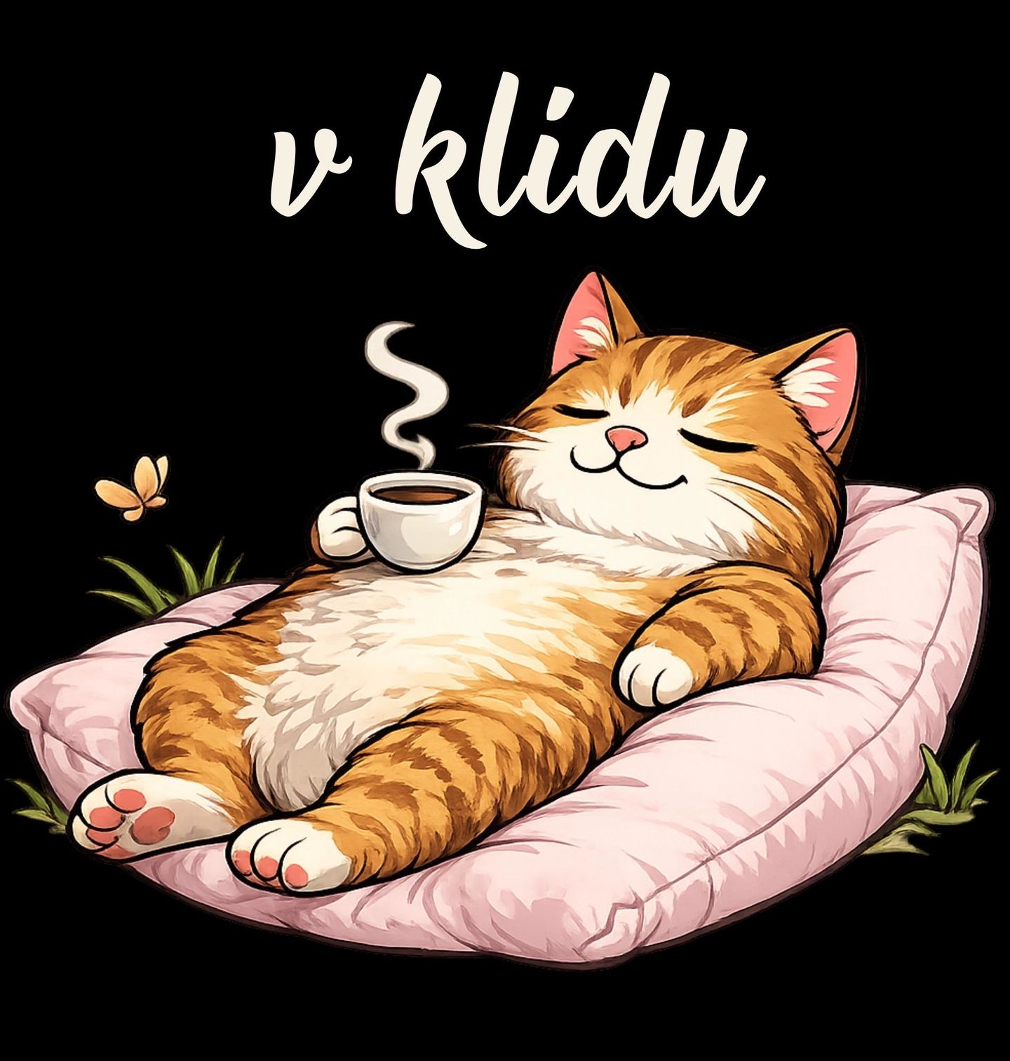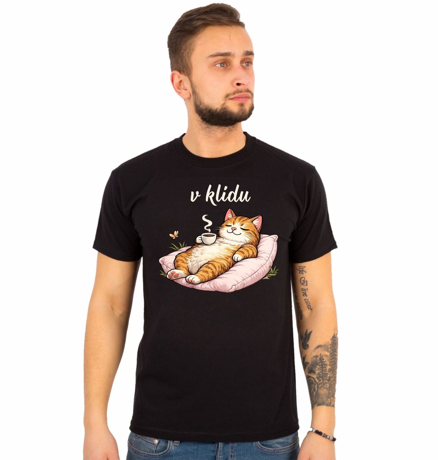 Pánské tričko Chillující Kočka s Kávou V klidu. Roztomilý motiv „V klidu“ zobrazuje spokojenou kočka odpočívající na polštáři s šálkem, kde nechybí ani horká káva. Tento design dokonale vystihuje pohodu, relax a chvíle, kdy se svět na okamžik zastaví. Ideální volba pro každého, kdo miluje kočky, ranní rituály a voňavá káva patří k jeho oblíbeným momentům dne.