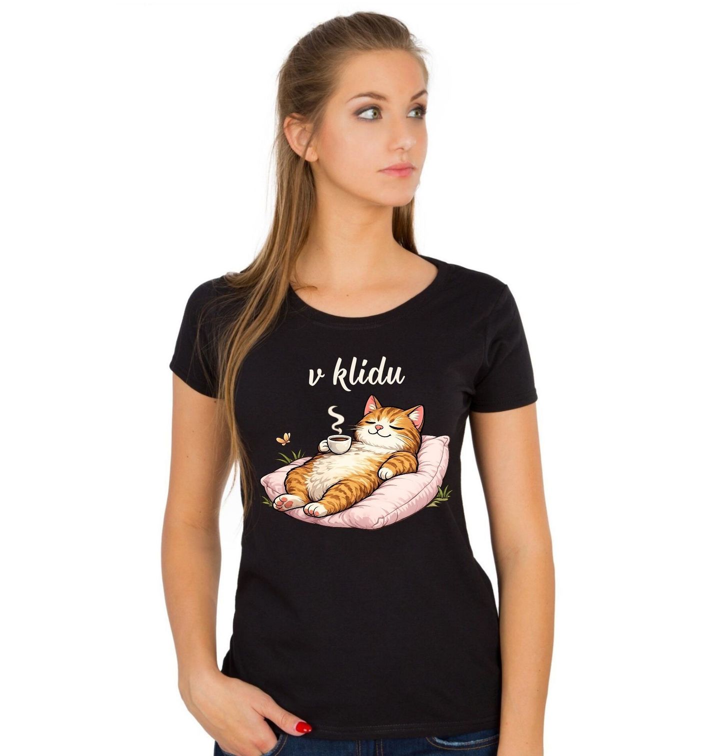 Dámské tričko Chillující Kočka s Kávou V klidu. Roztomilý motiv „V klidu“ zobrazuje spokojenou kočka odpočívající na polštáři s šálkem, kde nechybí ani horká káva. Tento design dokonale vystihuje pohodu, relax a chvíle, kdy se svět na okamžik zastaví. Ideální volba pro každého, kdo miluje kočky, ranní rituály a voňavá káva patří k jeho oblíbeným momentům dne.