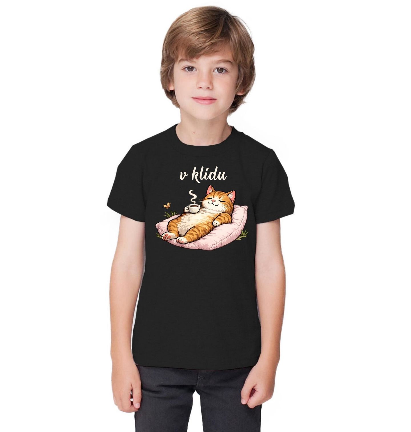Dětské tričko Chillující Kočka s Kávou V klidu. Roztomilý motiv „V klidu“ zobrazuje spokojenou kočka odpočívající na polštáři s šálkem, kde nechybí ani horká káva. Tento design dokonale vystihuje pohodu, relax a chvíle, kdy se svět na okamžik zastaví. Ideální volba pro každého, kdo miluje kočky, ranní rituály a voňavá káva patří k jeho oblíbeným momentům dne.