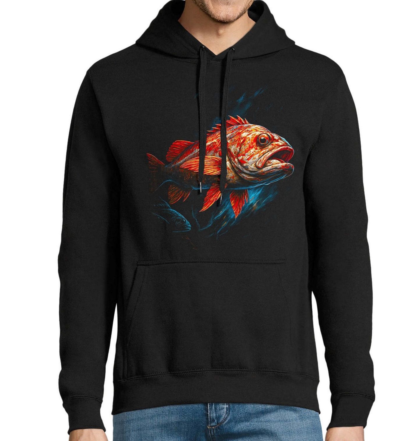 Pánská mikina Chňapal červený. Zobrazeným druhem je chňapal červený, jedna z nejceněnějších ryb sportovního i komerčního rybolovu. Chňapal červený je známý svou silou, opatrností a výskytem v hlubších vodách, kde vyžaduje zkušenost, trpělivost a správnou taktiku. Právě proto je symbolem poctivého rybaření a mistrovství u vody, se kterým nechce žádný rybář podcenit souboj.