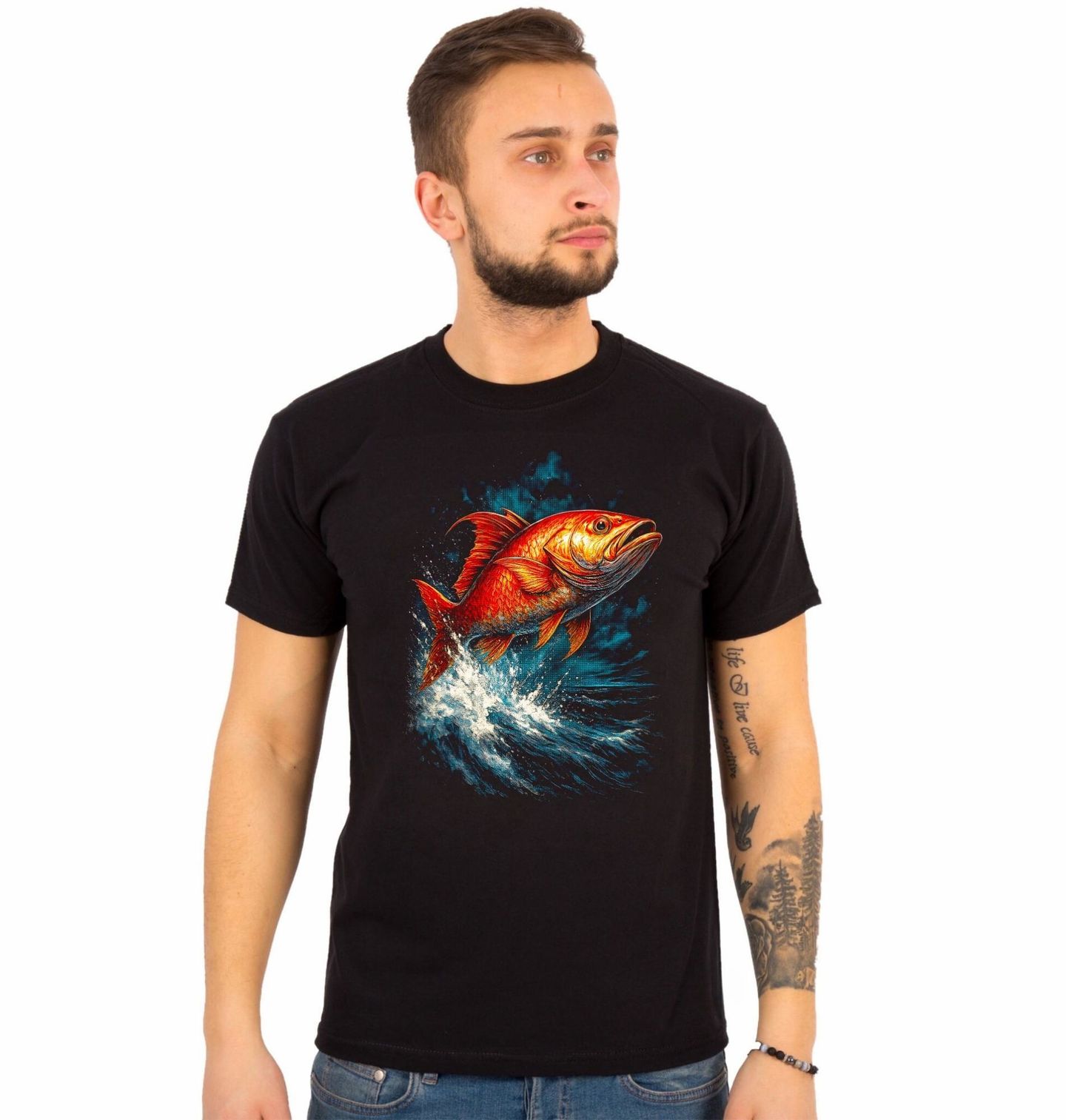 Pánské tričko Chňapal červený Vyskakující z Vody. Právě takové chvíle spojují rybaření a potápění – respekt k síle moře, k jeho obyvatelům a k okamžikům, které nelze naplánovat. Zobrazeným druhem je chňapal červený, ikonická mořská ryba známá svou silou, rychlým výpadem a tvrdým soubojem. Chňapal červený obývá útesy a otevřenější vody, kde je obávaným predátorem.