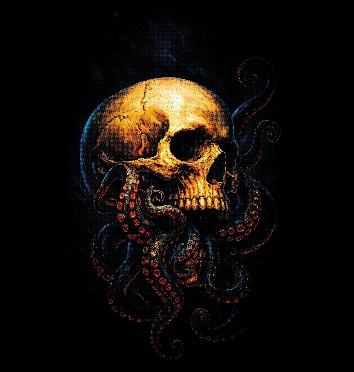 Dámské tričko Chobotnice s Lebkou. Dominantní lebka je propletena chapadly, která připomínají neúprosnou sílu, jakou představuje chobotnice v temných hlubinách. Tato lebka symbolizuje pomíjivost a konec, zatímco chobotnice dodává motivu dynamiku, inteligenci a nevyzpytatelnost. Společně vytváří obraz, který působí zároveň děsivě i fascinujícím dojmem.