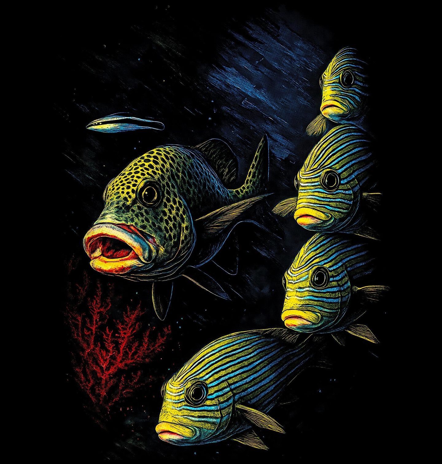 Dámské tričko Chrochtal pruhovaný. Zobrazeným druhem je chrochtavec pruhovaný, typická útesová ryba tropických moří. Chrochtavci jsou známí svými silnými pysky, pomalým, sebejistým pohybem a častým výskytem v blízkosti potápěčů. Setkání s nimi patří k oblíbeným zážitkům každého potápeč, který objevuje korálové útesy v jejich přirozeném rytmu.