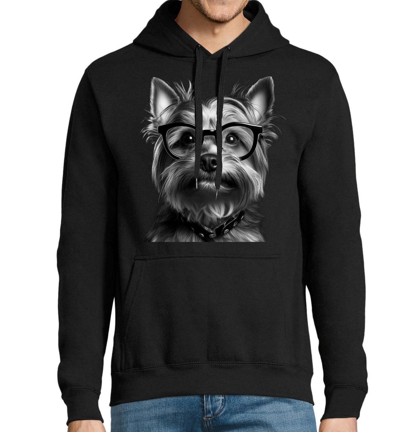 Pánská mikina Chytrý Jorkšírský teriér s Brýlemi. Originální motiv, kde vystupuje Jorkšírský teriér v klasických brýlích ve stylu malého šprta, potěší každého milovníka psů i humoru. Roztomilý design zdůrazňuje chytrý a zvědavý výraz, který tomuto plemeni dokonale sedí. Tento motiv je ideální pro každého, kdo je hrdý pejskař a chce ukázat, že pes může být nejen roztomilý, ale i stylově „učený“.