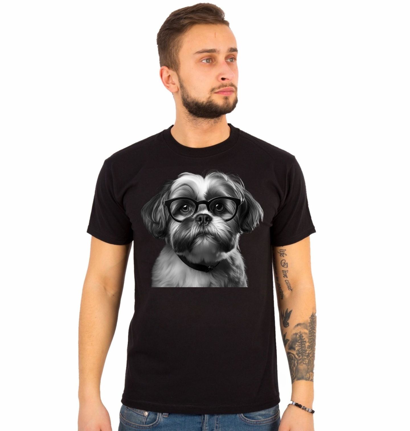 Pánské tričko Chytrý Shih-tzu s Brýlemi. Vtipný a originální motiv, kde vystupuje Shih-tzu v klasických brýlích ve stylu malého šprta, potěší každého milovníka psů i humoru. Tento design zvýrazňuje chytrý a zvědavý výraz, který k tomuto plemeni skvěle sedí. Ideální volba pro každého, kdo je hrdý pejskař a ví, že pes může být nejen roztomilý, ale i stylově „učený“.