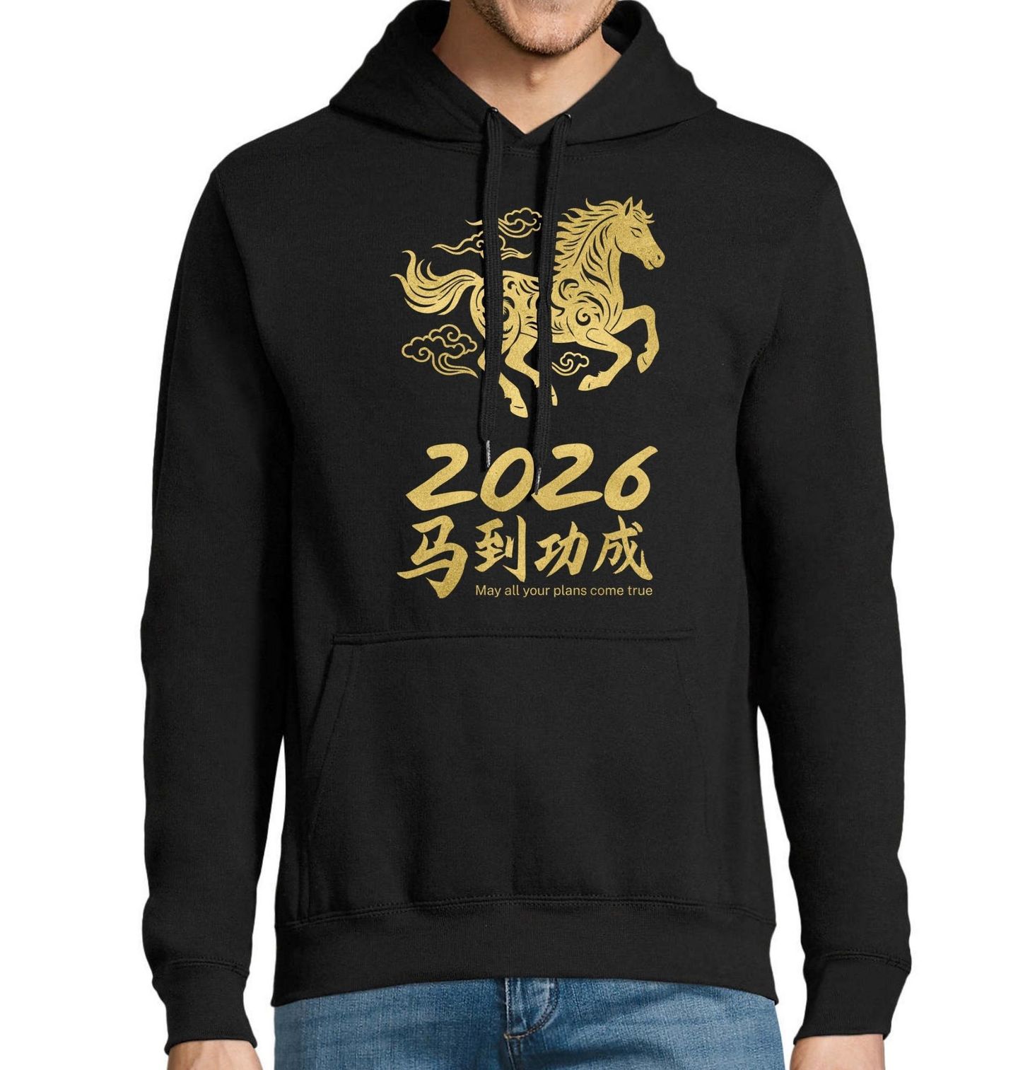 Pánská mikina Čínský nový rok 2026 Ať se splní všechny tvé plány. “May all your plans come true”. Elegantní a symbolický motiv oslavující čínský nový rok a energii, kterou přináší čínský rok ohnivého koně. Dominantním prvkem je zlatý kůň, tradiční symbol síly, úspěchu, vytrvalosti a splněných přání. Tento motiv v sobě spojuje harmonii, štěstí a pohyb vpřed, které jsou s rokem koně neodmyslitelně spojené.