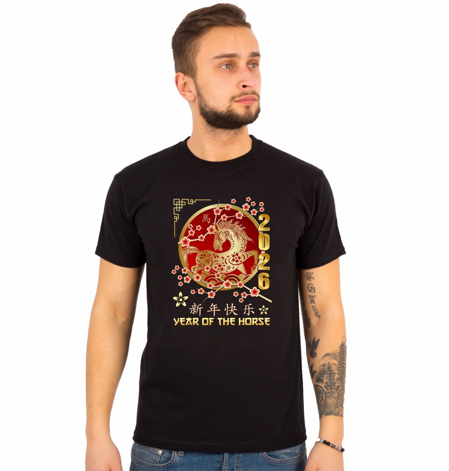 Pánské tričko Čínský Ohnivý Kůň Rok 2026. Elegantní a výrazný motiv zobrazuje zlatě zdobeného tvora kůň v tradičním asijském stylu, obklopeného květy sakury a doplněného číslem 2026. Design je inspirovaný energií, kterou přináší čínský rok ohnivého koně. Pokud miluješ astrologii a zajímá tě horoskop, tenhle motiv ti bude dělat radost každý den.