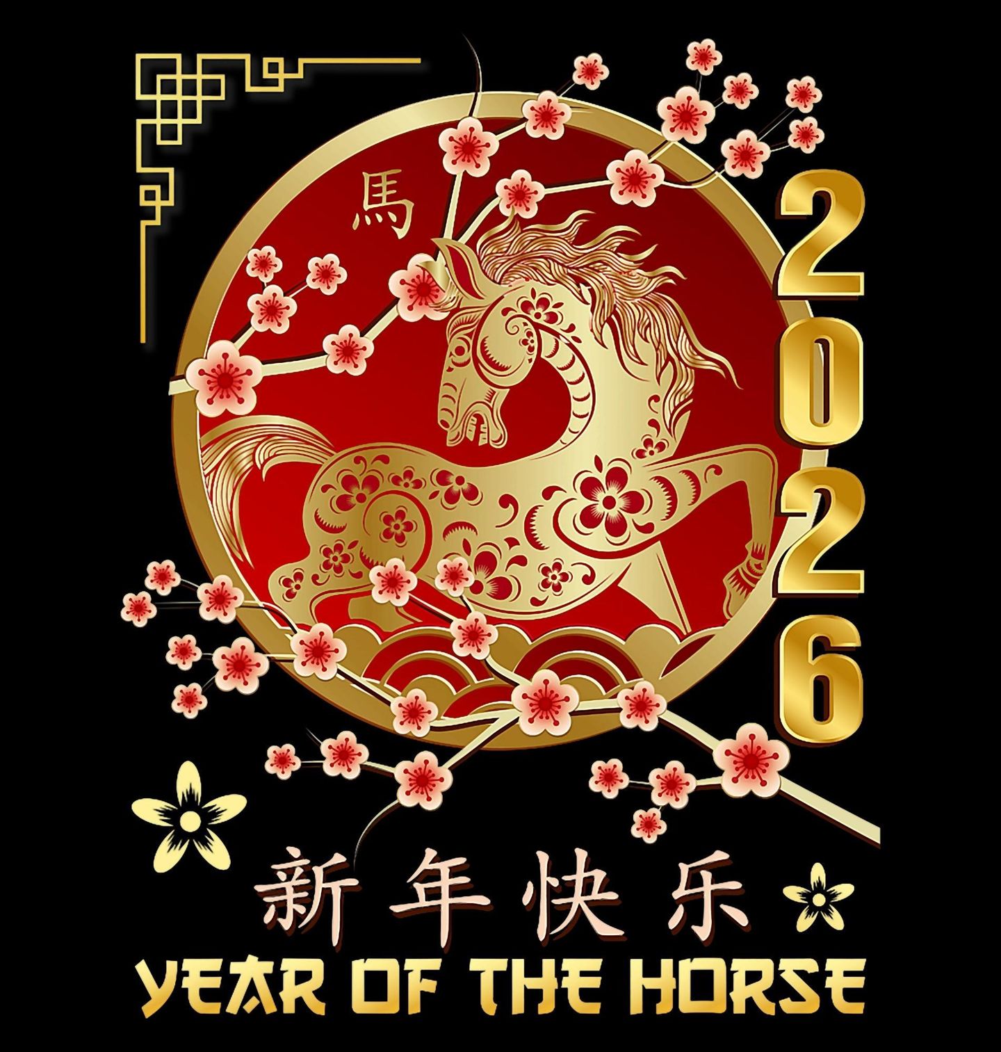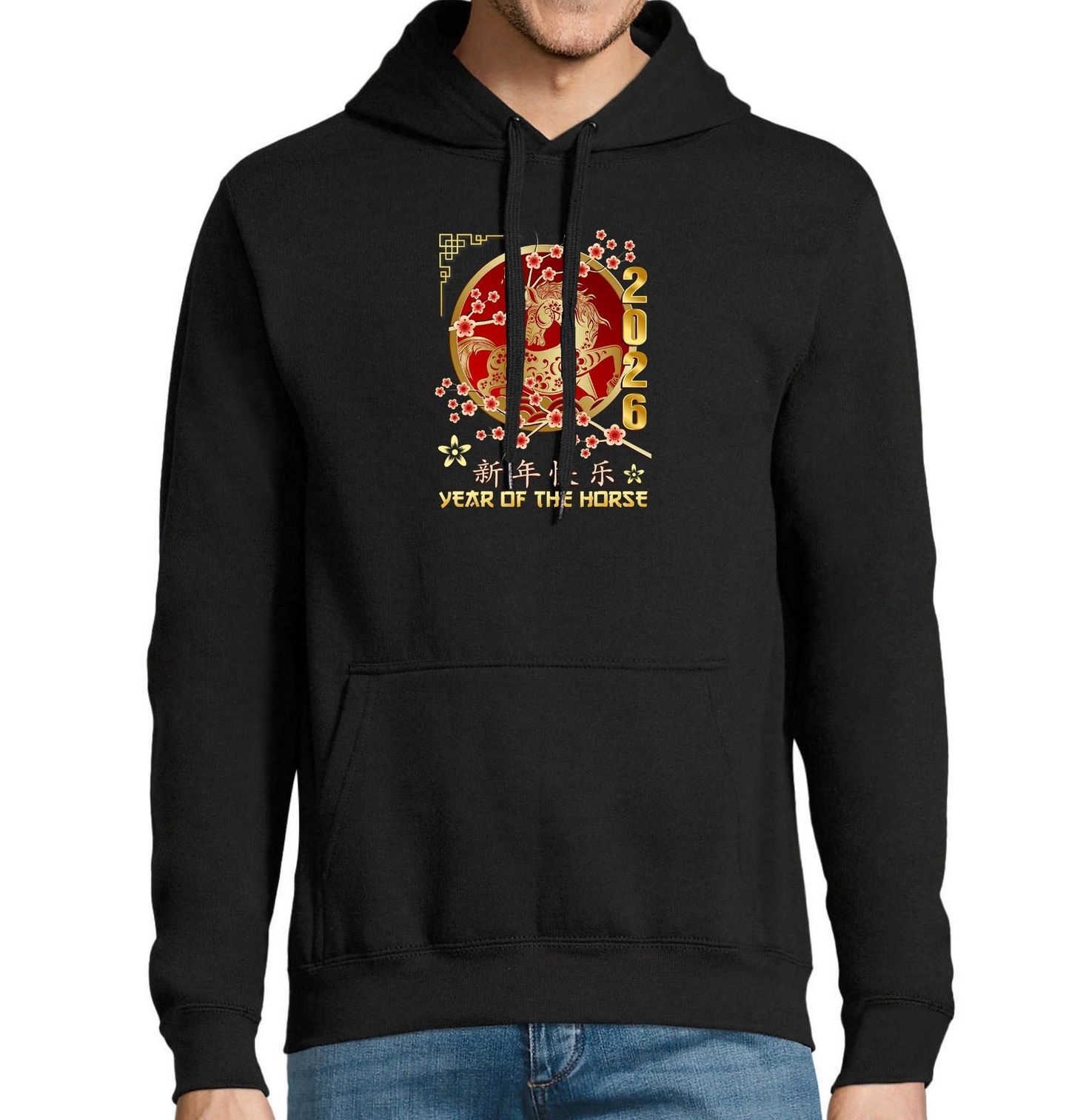 Pánská mikina Čínský Ohnivý Kůň Rok 2026. Elegantní a výrazný motiv zobrazuje zlatě zdobeného tvora kůň v tradičním asijském stylu, obklopeného květy sakury a doplněného číslem 2026. Design je inspirovaný energií, kterou přináší čínský rok ohnivého koně. Pokud miluješ astrologii a zajímá tě horoskop, tenhle motiv ti bude dělat radost každý den.