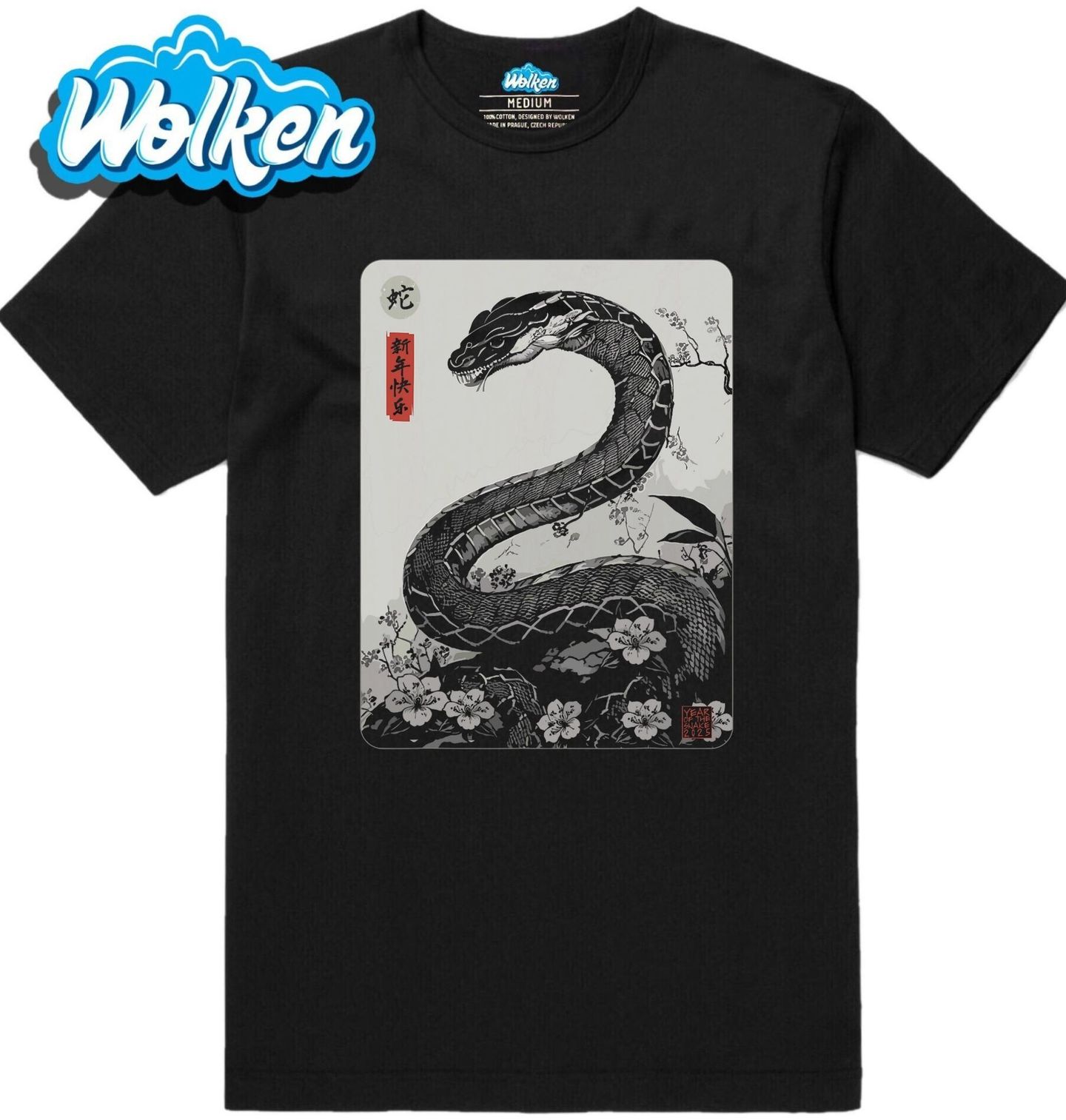 Pánské tričko Čínský Rok Hada 2025. Motiv hada inspirovaný tradičním japonským uměním znázorňuje majestátního plaza ve výrazném černobílém provedení. Text v červeném rámečku: 新年快乐 = „šťastný nový rok“. Text dole v rohu: „Year of the Snake 2025“ – odkazuje na čínský lunární kalendář, kde je 2025 rokem hada.