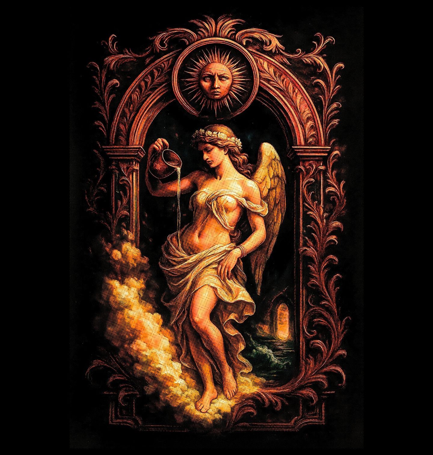 Dámské tričko Číšník Bohů Ganymedes Aquarius. Tajemná okřídlená postava vznášející se mezi nebem a zemí vylévá proud vody z nádoby – symbol Vodnáře, jednoho z nejznámějších znamení zvěrokruhu. V kontextu, který nabízí řecká mytologie, je Vodnář často spojován s postavou Ganyméda – mladíka, kterého Zeus unesl na Olymp, aby se stal číšníkem bohů.