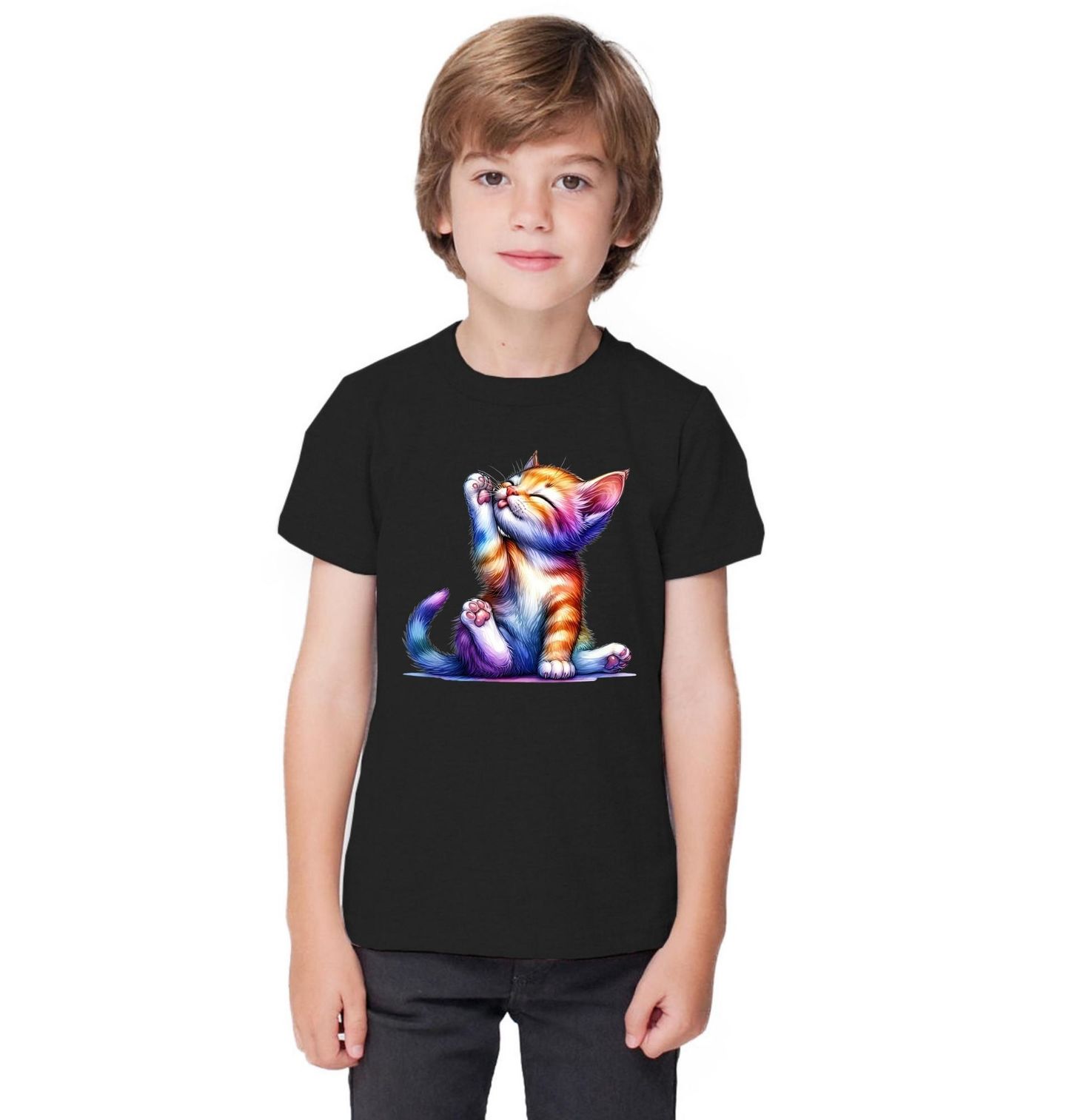 Dětské tričko Čistící se Kotě. Tento motiv zachycuje kotě, jak se čistí – přirozený a roztomilý okamžik, kdy se kočka stará sama o sebe. Detailní ilustrace zvýrazňuje hebkou srst, jemný pohyb tlapky a klidnou atmosféru, kterou kotě při péči o svou srst vyzařuje. Design je ideální pro všechny milovníky zvířat, zejména pro ty, kteří mají blízký vztah ke kočkám.