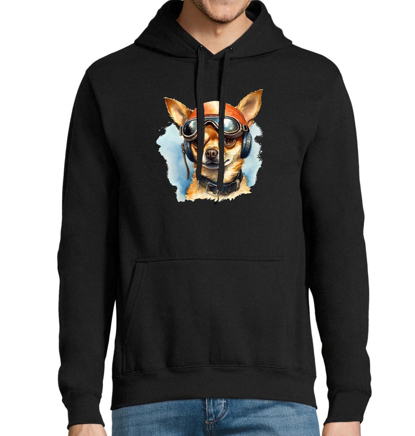 Pánská mikina Čivava Pilot. Perfektní volbou pro každého, kdo miluje dobrodružství, letadla a věrného společníka na čtyřech tlapkách. Odvážný pes v pilotní helmě s brýlemi dodá vašemu outfitu styl a vtip. Ideální dárek pro každého pejskaře, který má rád originální motivy a samozřejmě pro fanoušky plemene čivava.