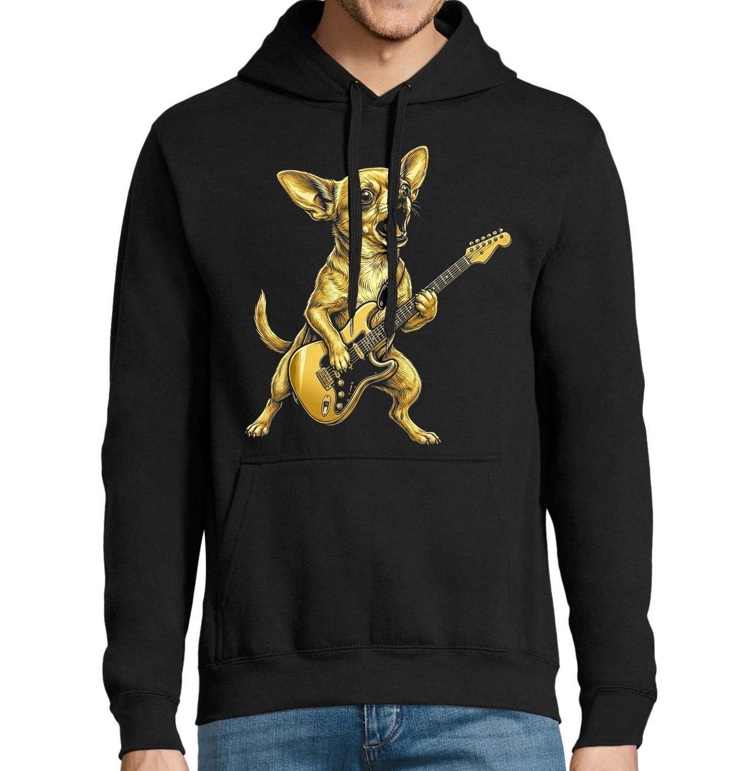 Pánská mikina Čivava Rocková Hvězda. Energetický motiv zachycuje psa plemene čivava jako opravdovou rockovou hvězdu s elektrickou kytarou. Dynamická póza a výraz plný energie vytvářejí zábavný a stylový design pro všechny milovníky hudby i psů. Tento pes motiv spojuje humor, hudbu a jedinečný charakter malého, ale odvážného plemene.