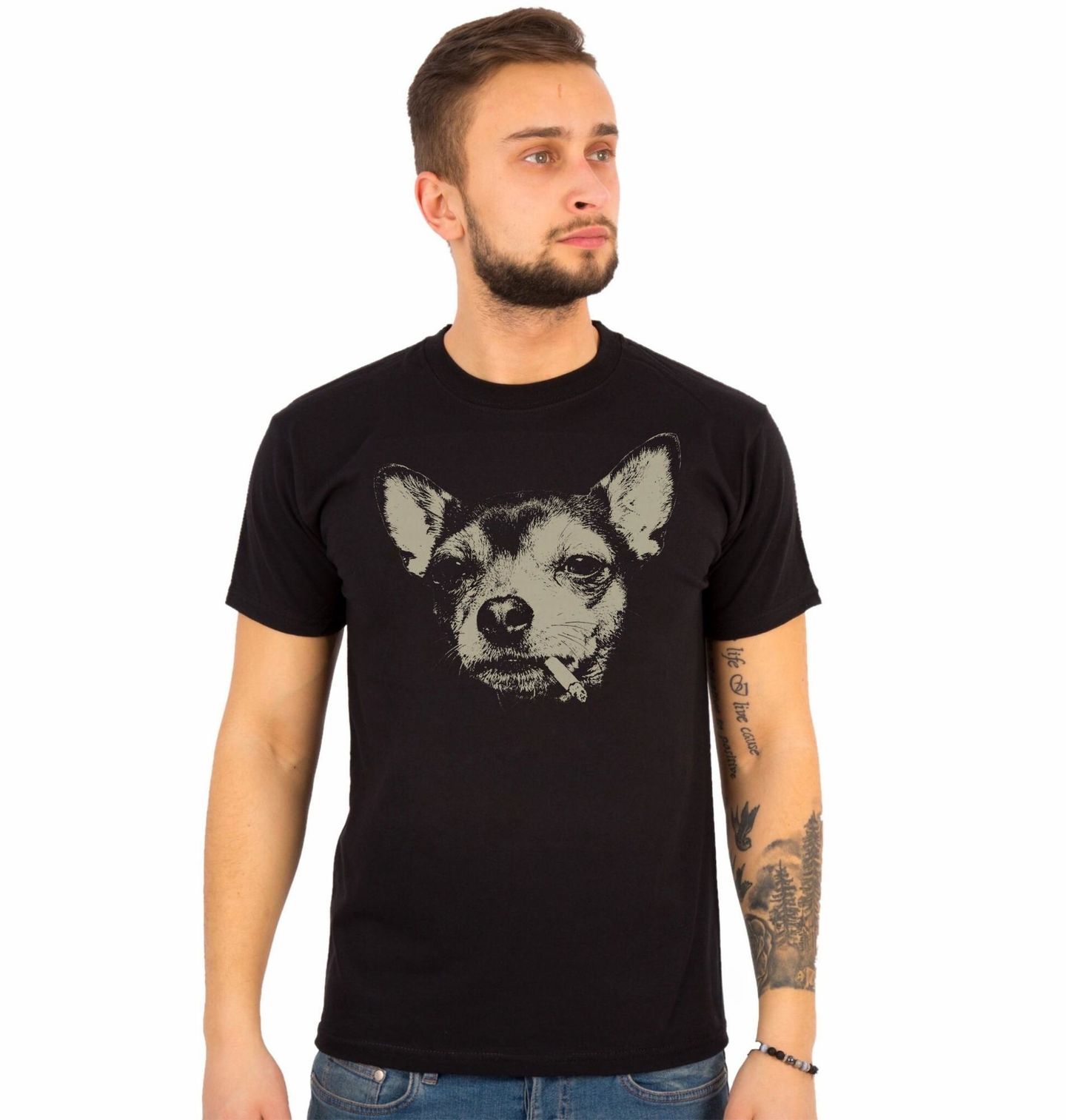 Pánské tričko Čivava s Cigaretou. Originální motiv zachycuje psa plemene čivava v netradiční a lehce rebelské podobě. Kontrast roztomilého výrazu a cigarety vytváří vtipný a výrazný design, který okamžitě upoutá pozornost. Tento grafický pes motiv potěší milovníky malých plemen, humoru i odvážných ilustrací.