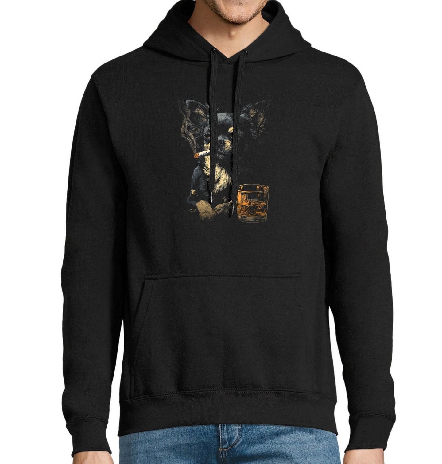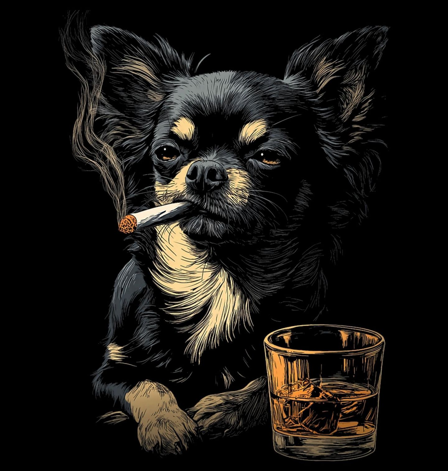 Pánská mikina Čivava s Whiskey a Cigaretou. Originální a lehce rebelsky laděný design, na kterém je vyobrazen pes Chihuahua s cigaretou v tlamě a sklenkou whiskey před sebou. Motiv je zpracován detailní ilustrační kresbou na tmavém pozadí, které připomíná barové prostředí. Ideální pro každého milovníka tohoto drobného, ale charakterního plemene — zkrátka pro opravdového pejskař.