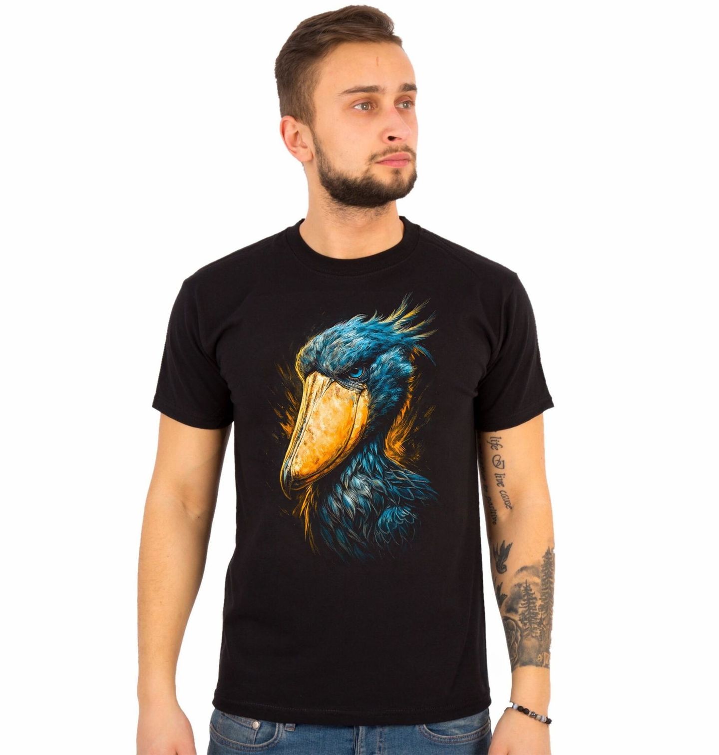 Pánské tričko Člunozobec africký. Člunozobec africký je samotářský pták, žijící v afrických bažinách a mokřadech, kde trpělivě vyčkává na kořist. Motiv vyzařuje sílu, klid a respekt k přírodě. Díky temnému pozadí a detailní kresbě peří je tento pták ideální volbou pro milovníky exotiky, divoké přírody a netradičních zvířecích motivů.