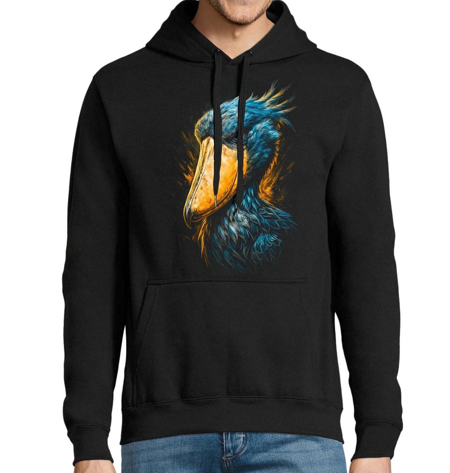 Pánská mikina Člunozobec africký. Člunozobec africký je samotářský pták, žijící v afrických bažinách a mokřadech, kde trpělivě vyčkává na kořist. Motiv vyzařuje sílu, klid a respekt k přírodě. Díky temnému pozadí a detailní kresbě peří je tento pták ideální volbou pro milovníky exotiky, divoké přírody a netradičních zvířecích motivů.