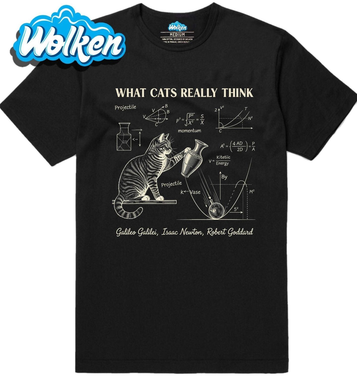 Pánské tričko Co si kočky opravdu myslí What cats really think. Tato vtipná ilustrace odhaluje, co si kočka opravdu myslí, když zkoumá svět – a zejména, když shazuje věci ze stolu. V duchu velkých myslitelů jako Galileo Galilei, Isaac Newton nebo Robert Goddard analyzuje trajektorii padající vázy a počítá hybnost i kinetickou energii.