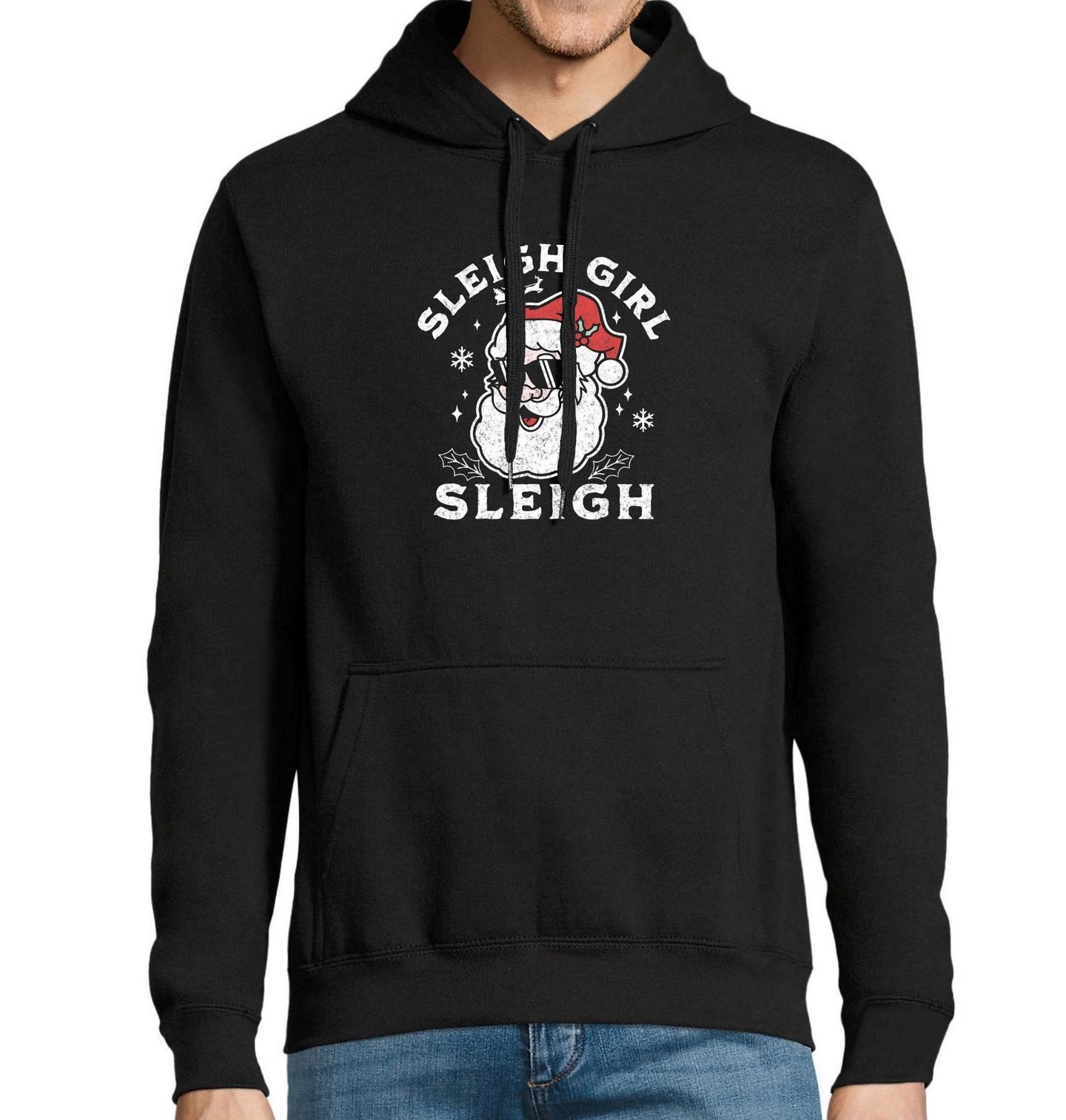 Pánská mikina Cool Santa Sleigh Girl Sleigh. Nápis „Sleigh Girl Sleigh“ je slovní hříčka: Sleigh = sáně (tedy klasický vánoční motiv se Santou), Slay = slangově „zářit, vyniknout“. Skvělý tip na originální dárek, který spojí sváteční atmosféru s moderním stylem. Vánoce a santa nikdy nevypadali tak trendy!