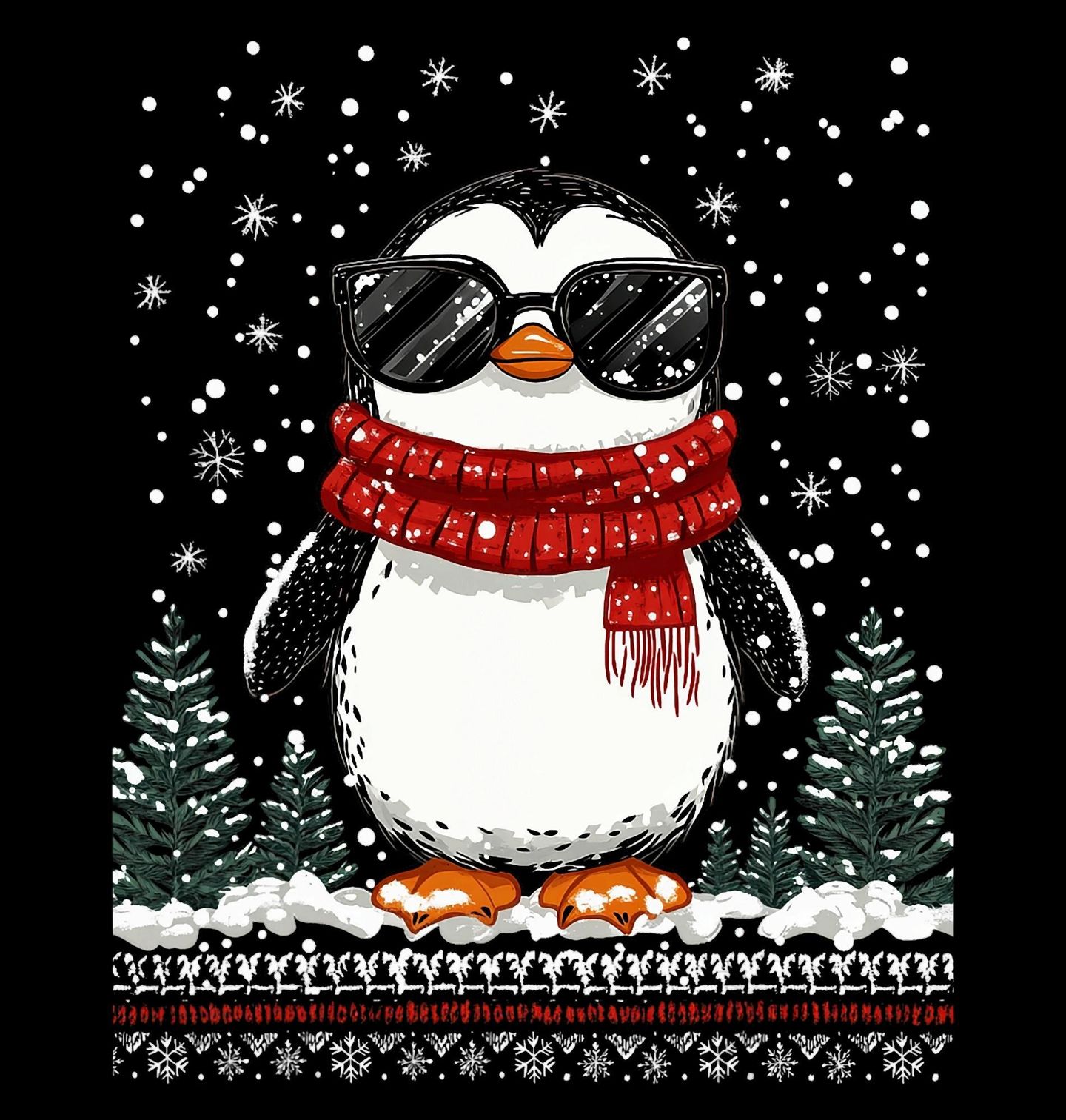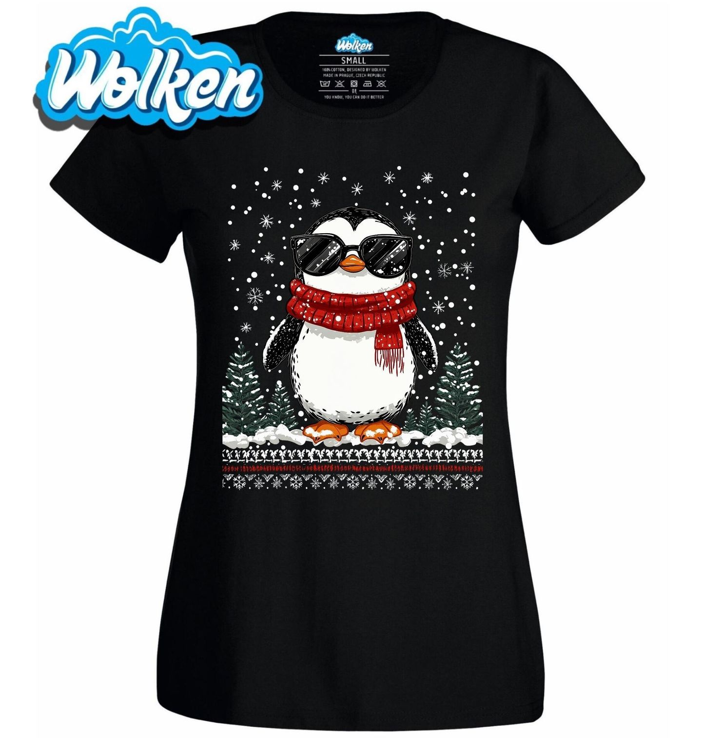 Dámské tričko Cool Tučňák ve Sněhu. Stylový motiv, který spojuje Vánoce, roztomilého tučňáka a padající sníh. Tučňák s červenou šálou a slunečními brýlemi stojí uprostřed zimní krajiny, kolem něj sněhové vločky a zasněžené stromky. Tento design je ideální pro všechny, kdo milují zimní atmosféru, Vánoce a originální motivy s tučňáky.