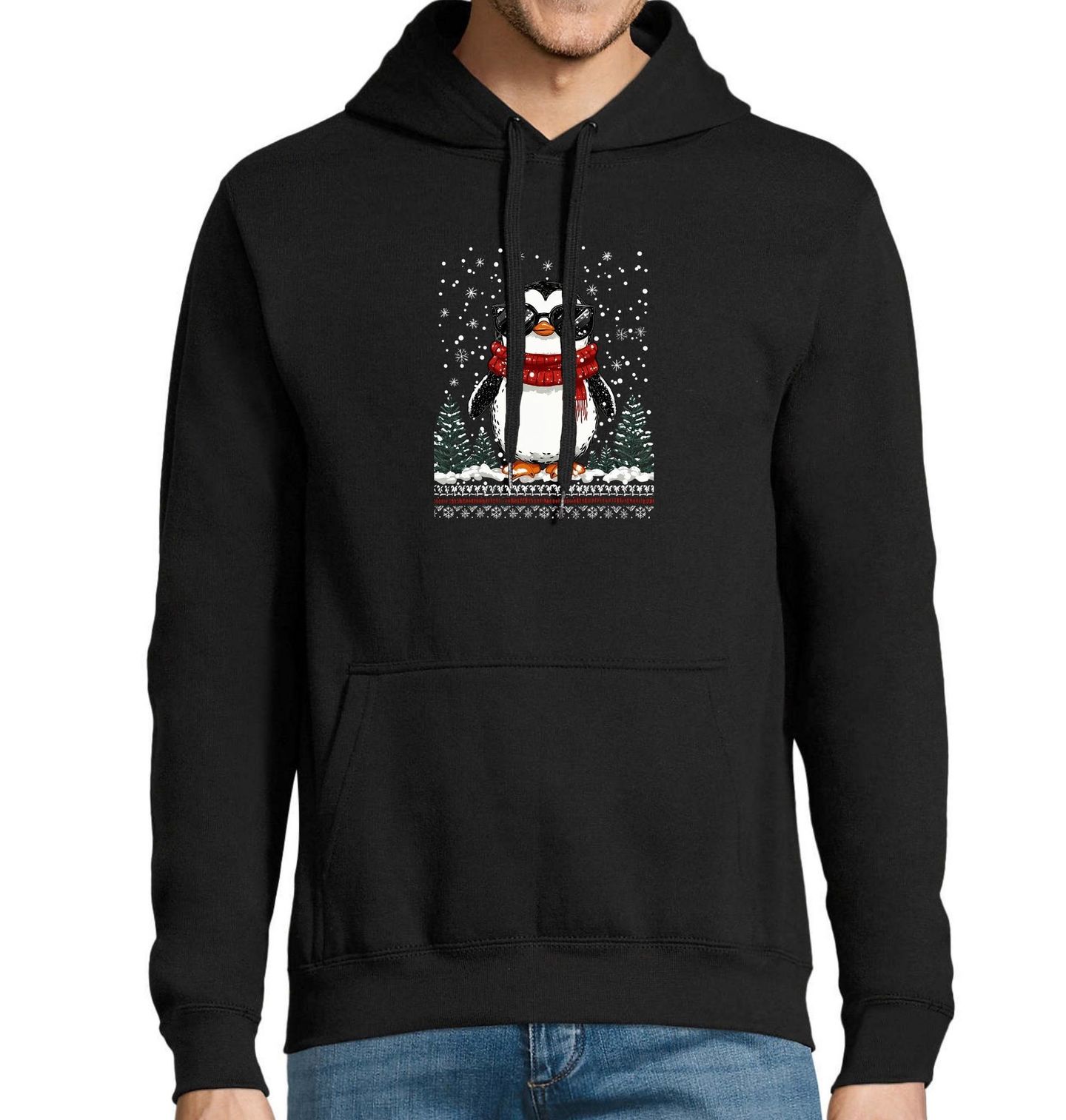 Pánská mikina Cool Tučňák ve Sněhu. Stylový motiv, který spojuje Vánoce, roztomilého tučňáka a padající sníh. Tučňák s červenou šálou a slunečními brýlemi stojí uprostřed zimní krajiny, kolem něj sněhové vločky a zasněžené stromky. Tento design je ideální pro všechny, kdo milují zimní atmosféru, Vánoce a originální motivy s tučňáky.