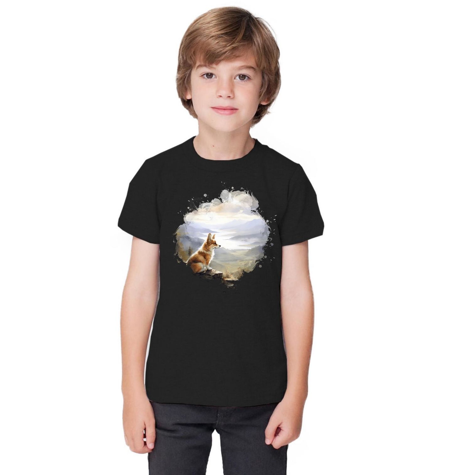 Dětské tričko Corgi na Vyhlídce. Klidný pes corgi tiše sedí na skalní vyhlídce a pozoruje rozlehlé údolí zalité světlem. Malá postava plemene corgi v kontrastu s velkolepou krajinou symbolizuje klid, věrnost a schopnost zastavit se v přítomném okamžiku. Motiv je ideální volbou pro každého pejskaře, který vnímá psa jako společníka na cestách a procházkách.