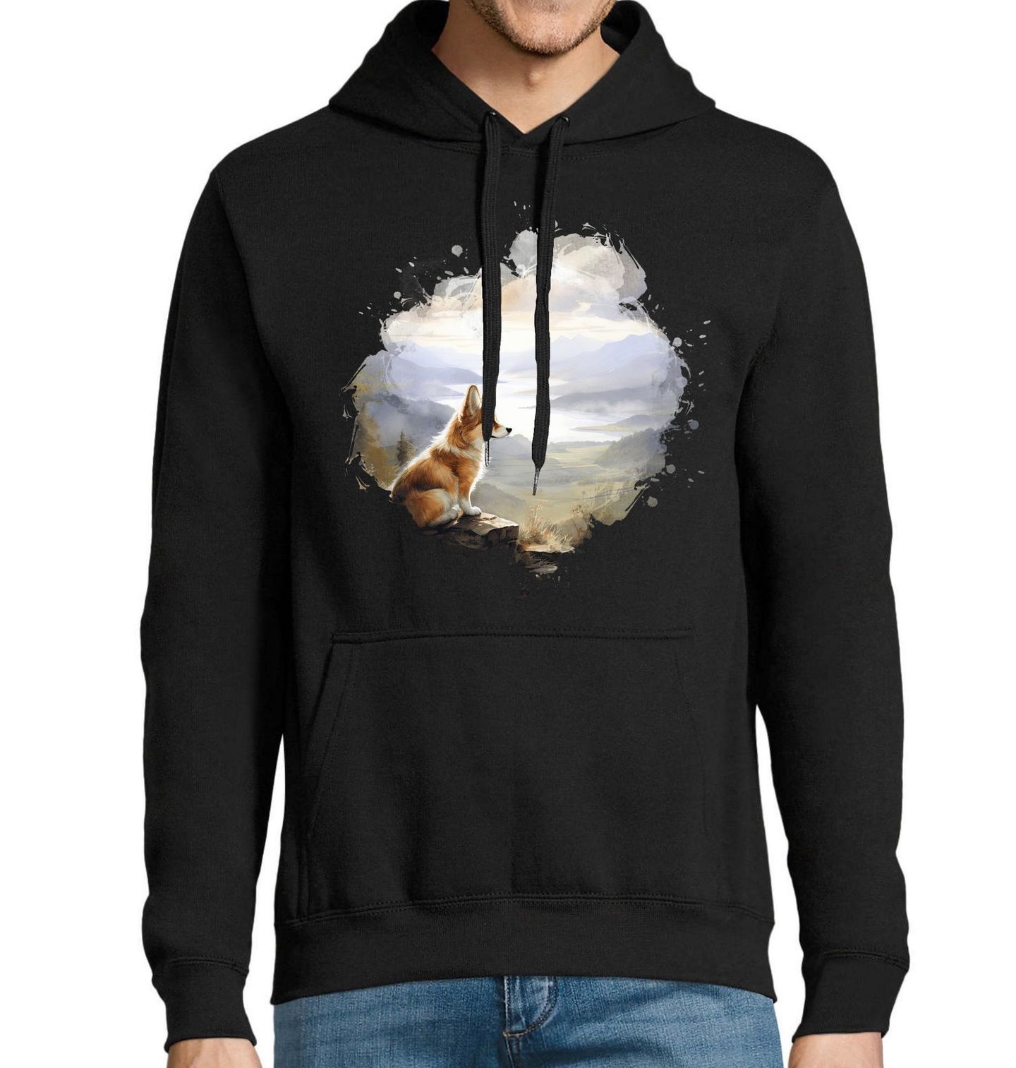 Pánská mikina Corgi na Vyhlídce. Klidný pes corgi tiše sedí na skalní vyhlídce a pozoruje rozlehlé údolí zalité světlem. Malá postava plemene corgi v kontrastu s velkolepou krajinou symbolizuje klid, věrnost a schopnost zastavit se v přítomném okamžiku. Motiv je ideální volbou pro každého pejskaře, který vnímá psa jako společníka na cestách a procházkách.