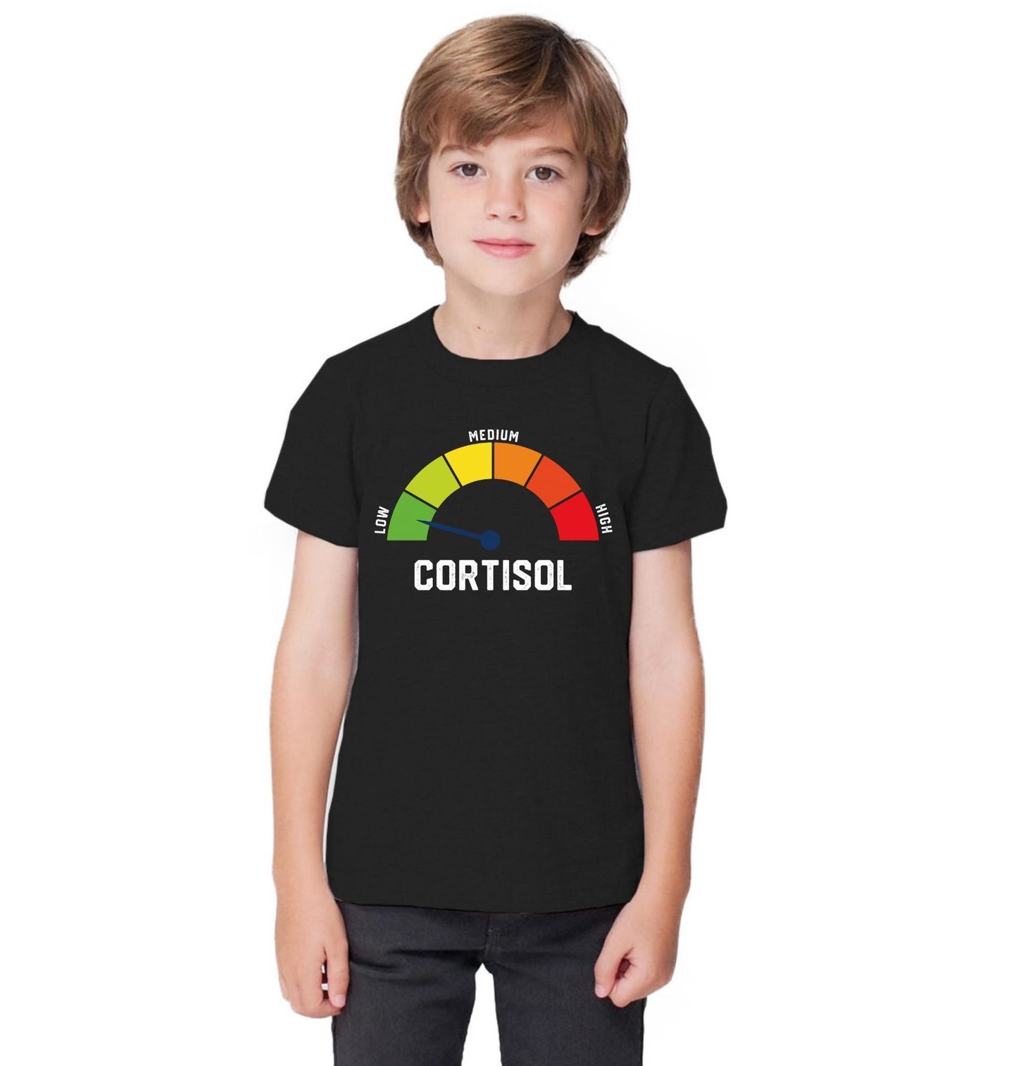 Dětské tričko Cortisol na Stupnici. Barevná zaoblená stupnice znázorňuje, jak se mění hladina hormonu kortizolu od nízké (LOW) přes střední (MEDIUM) až po vysokou (HIGH). Tento přehled pomáhá lépe pochopit, jak cortisol souvisí se stresem a proč je vyvážená hladina klíčem k pohodě a výkonu.