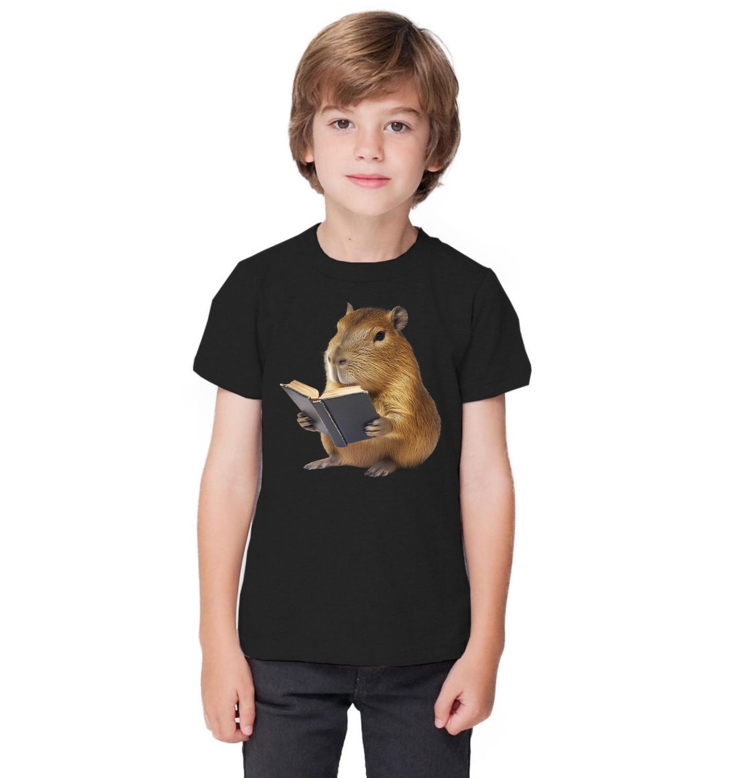 Dětské tričko Čtenář Kapybara. Originální design zobrazuje klidnou kapybara, která si užívá čtení a drží v tlapkách otevřené knihy. Motiv působí hravě i uklidňujícím dojmem a potěší každého, kdo miluje zvířata i svět literatury. Detailní zpracování dodává ilustraci jemný realistický styl a dělá z ní ideální doplněk pro každodenní nošení.