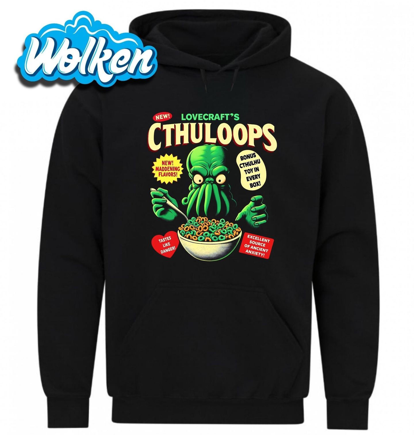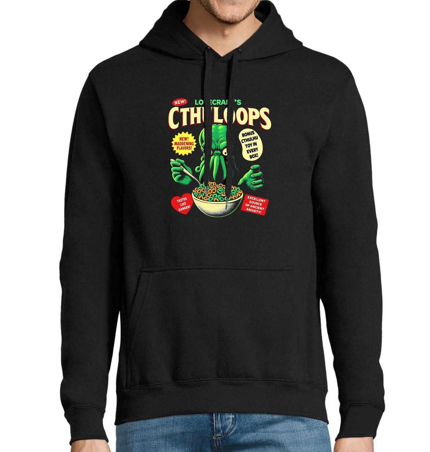 Pánská mikina Cthuloops Cereálie Cthulhu. Probouzej se s dávkou hrůzy! Tohle triko s motivem „Cthuloops“ je parodická pocta H. P. Lovecraftovi, Cthulhu a klasickým ranním cereáliím. Ideální pro milovníky temného humoru, hororu a popkulturních parodií. Na snídani je už pozdě – čas je jen iluze a šílenství má příchuť cereálií!