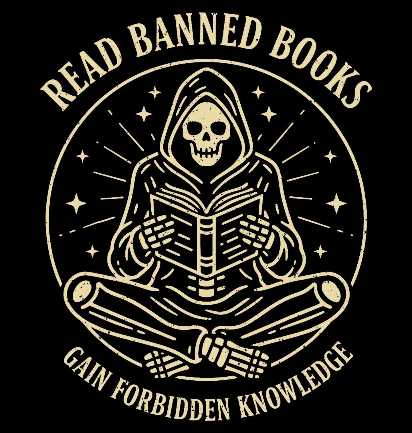 Dámské tričko Čti zakázané knihy Získej zakázané vědění. Originální a stylový motiv, na kterém je zobrazen kostlivec v kápi, jak v klidu sedí se zkříženýma nohama a soustředěně čte knihy. Design je doplněn anglickými nápisy „Read Banned Books“ a „Gain Forbidden Knowledge“. Celý motiv spojuje temný humor, záhadu a lásku ke čtení.