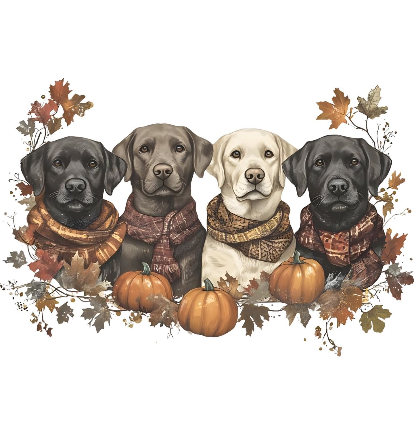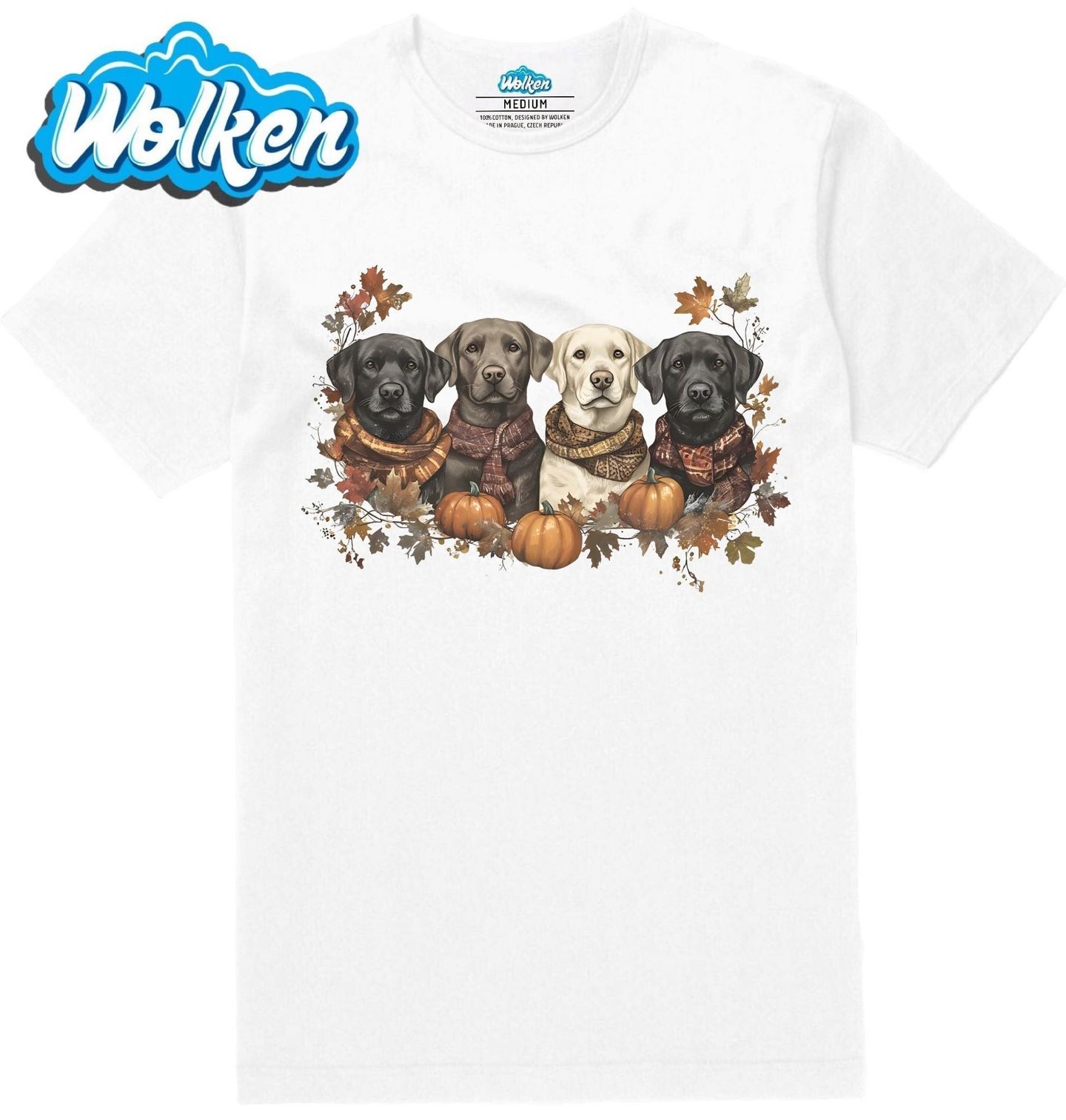 Pánské tričko Čtyři Podzimní Labradoři. Tento roztomilý motiv zachycuje čtyři labradory v podzimní atmosféře – s šálami, dýněmi a listím, které vytvářejí hřejivou a hravou náladu. Pes labradorský retrívr je známý svou přátelskou povahou a inteligencí. Design je jako stvořený pro každého pejskaře, který miluje podzim.