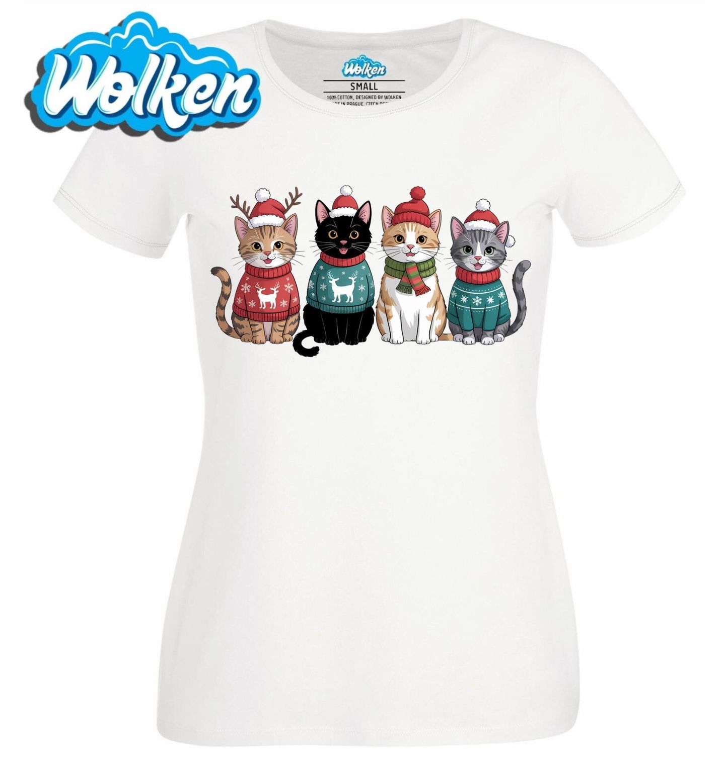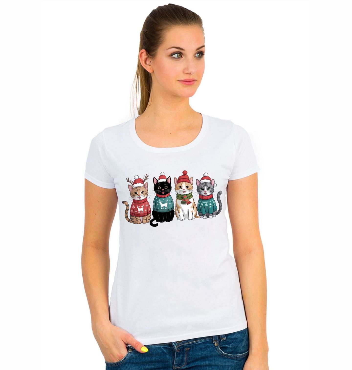 Dámské tričko Čtyři Vánoční Kočky. Roztomilá kočka ve vánočním svetříku přináší sváteční atmosféru! Tento motiv představuje čtyři veselá koťata oblečená do vánočních čepic a svetrů, ideální jako dárek nebo dekorace pro všechny milovníky koček a Vánoce.