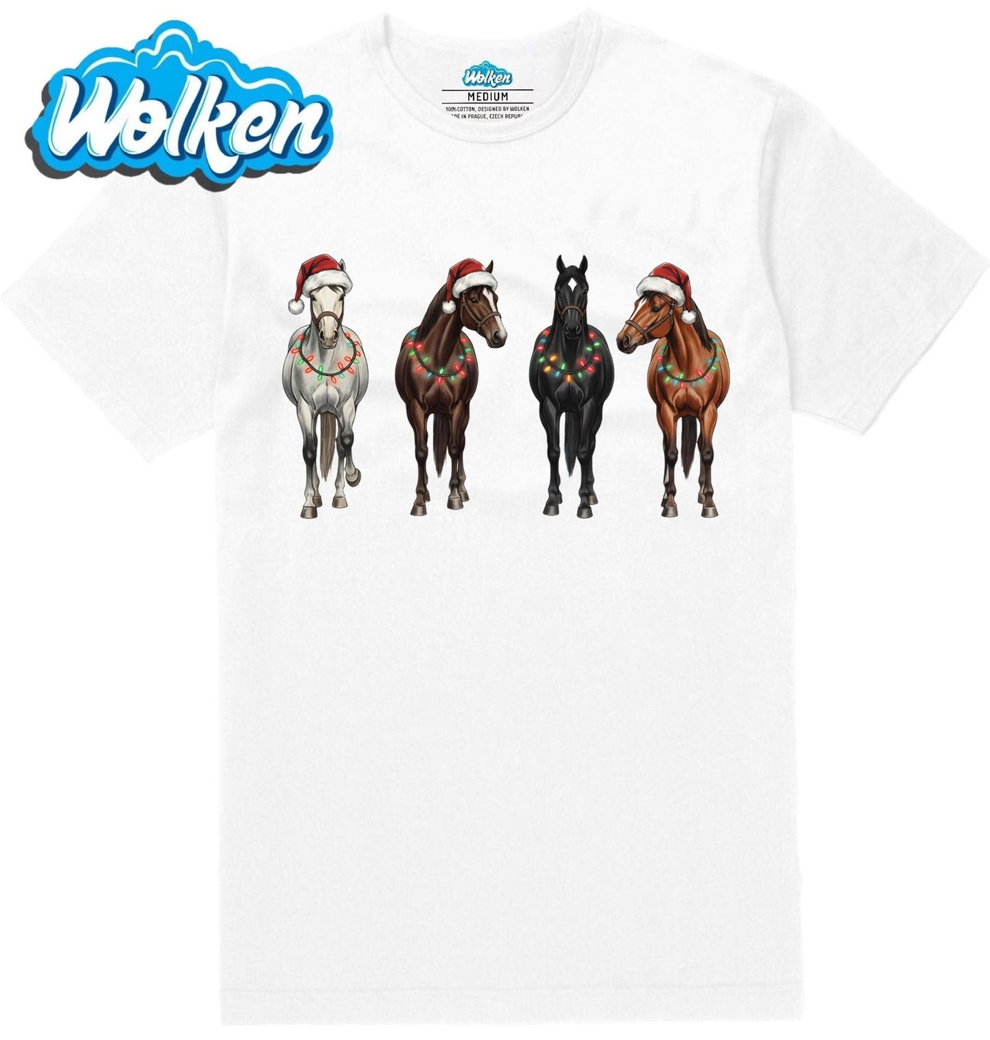 Pánské tričko Čtyři Vánoční Koně. Čtyři elegantní koně ozdobení vánočními světýlky a čepicemi přinášejí tu pravou sváteční náladu! Tento jedinečný motiv je ideální pro každého milovníka jezdeckého stylu a svátků. Ať už hledáš dárek pro koňáka nebo stylový zimní design, tento motiv s koňmi je dokonalou volbou pro Vánoce.