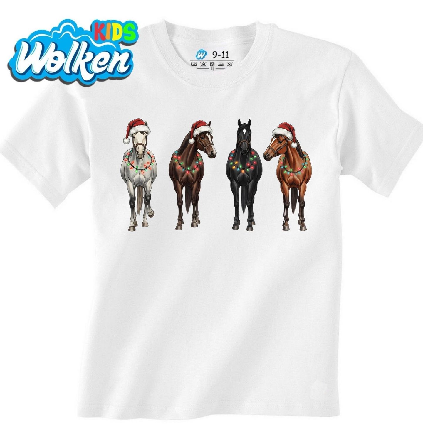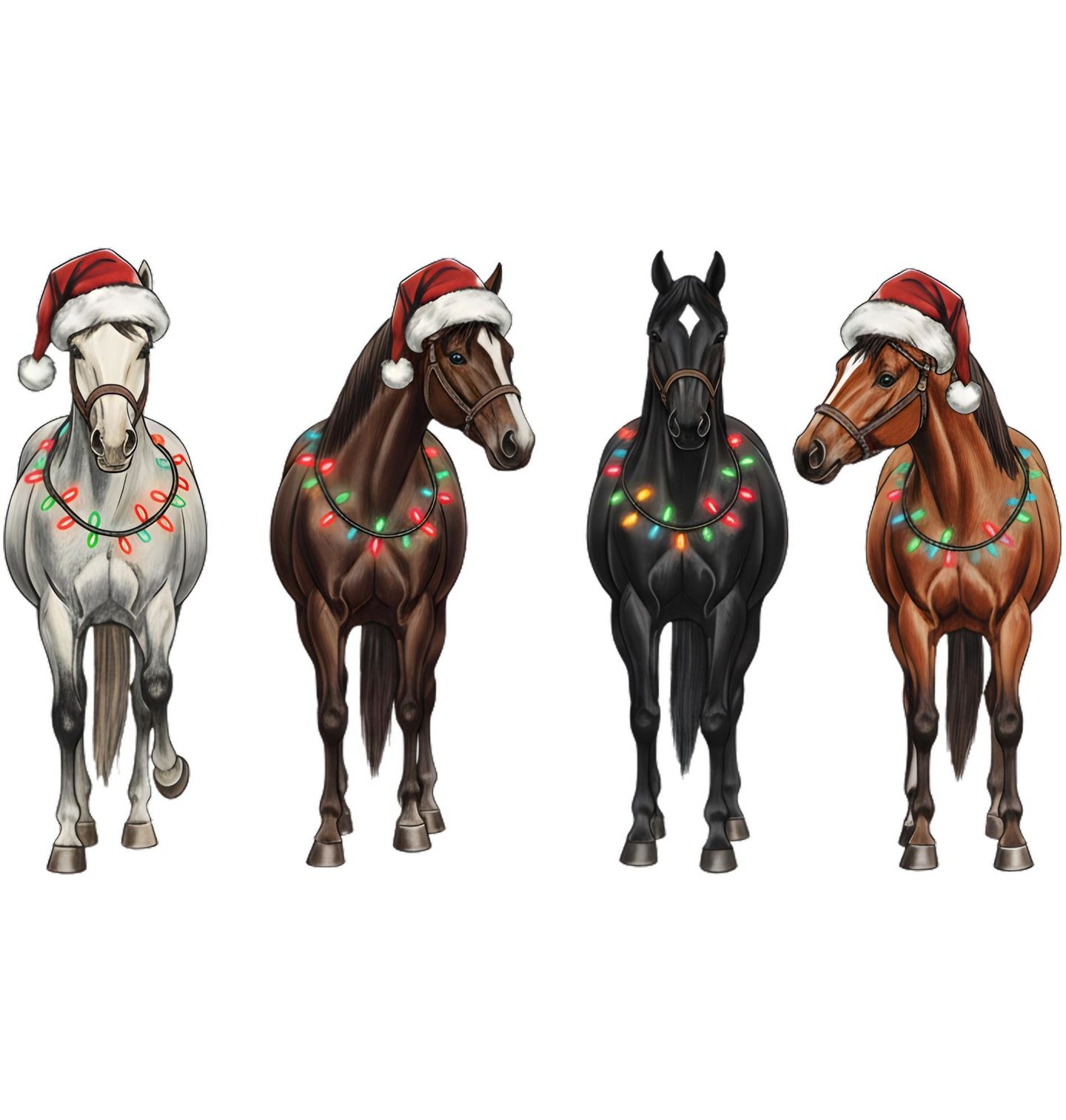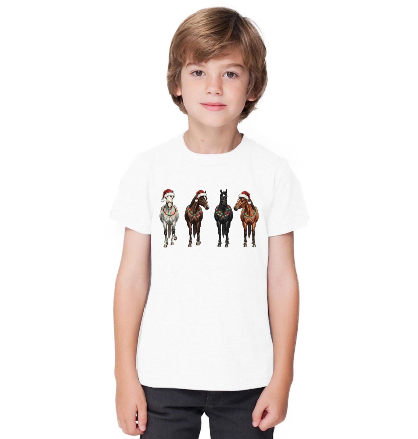 Dětské tričko Čtyři Vánoční Koně. Čtyři elegantní koně ozdobení vánočními světýlky a čepicemi přinášejí tu pravou sváteční náladu! Tento jedinečný motiv je ideální pro každého milovníka jezdeckého stylu a svátků. Ať už hledáš dárek pro koňáka nebo stylový zimní design, tento motiv s koňmi je dokonalou volbou pro Vánoce.