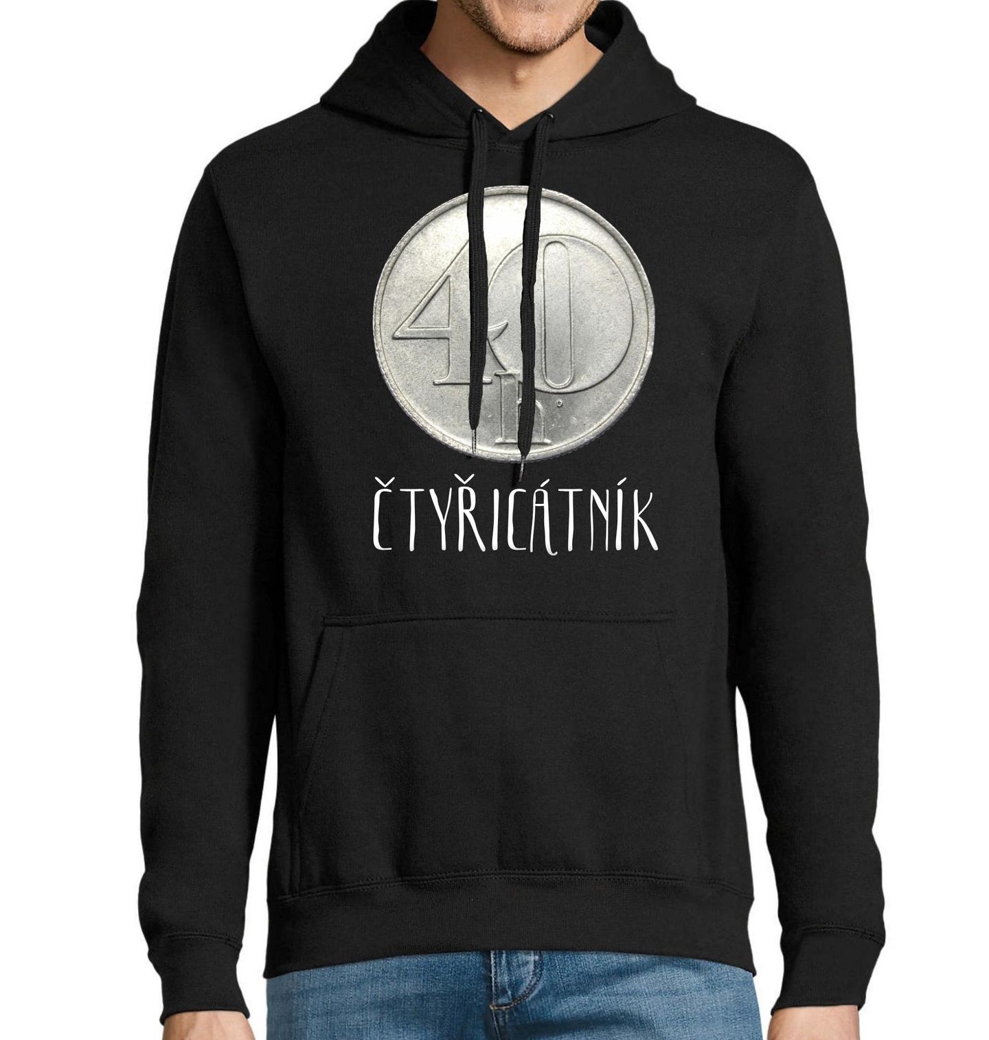 Pánská mikina Čtyřicátník 40. Kulatiny. Originální motiv 40 haléřů čtyřicátník je skvělou volbou pro každého, kdo slaví narozeniny a chce své kulatiny pojmout s humorem. Vtipný design inspirovaný starou mincí s motivem haléř zaujme na první pohled a pobaví každého oslavence i jeho okolí. Perfektně se hodí jako dárek k 40. narozeninám pro muže i ženy, kteří mají rádi nadsázku a originální styl.