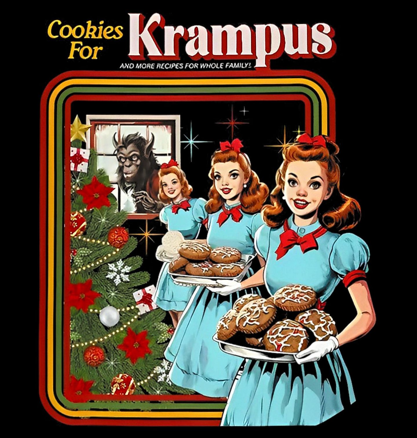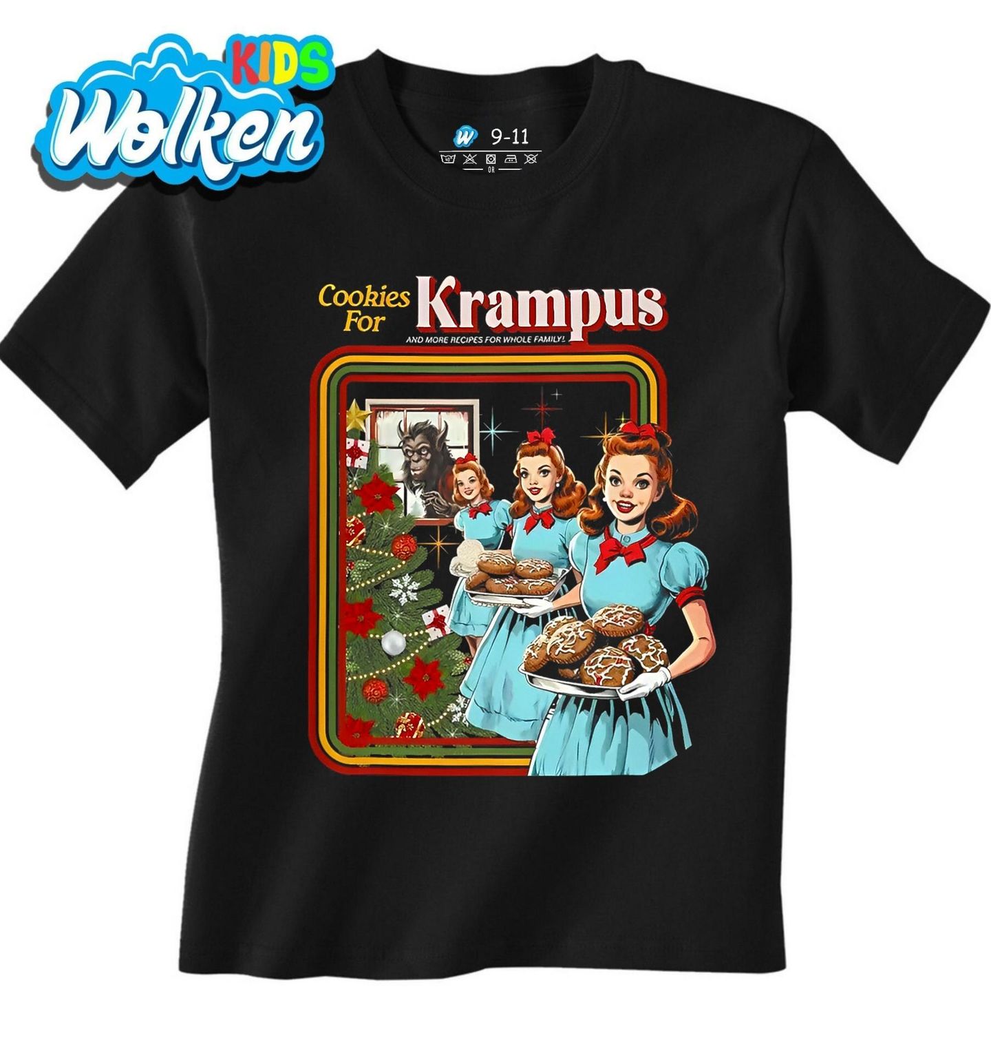 Dětské tričko Cukroví pro Krampuse. Udělejte si Vánoce trochu netradičně s originálním motivem „Cookies for Krampus (and more recipes for whole family!)“. Retro ilustrace spojuje klasickou vánoční pohodu s pekelným folklórem – zatímco dívky nabízejí cukroví, za oknem číhá Krampus.