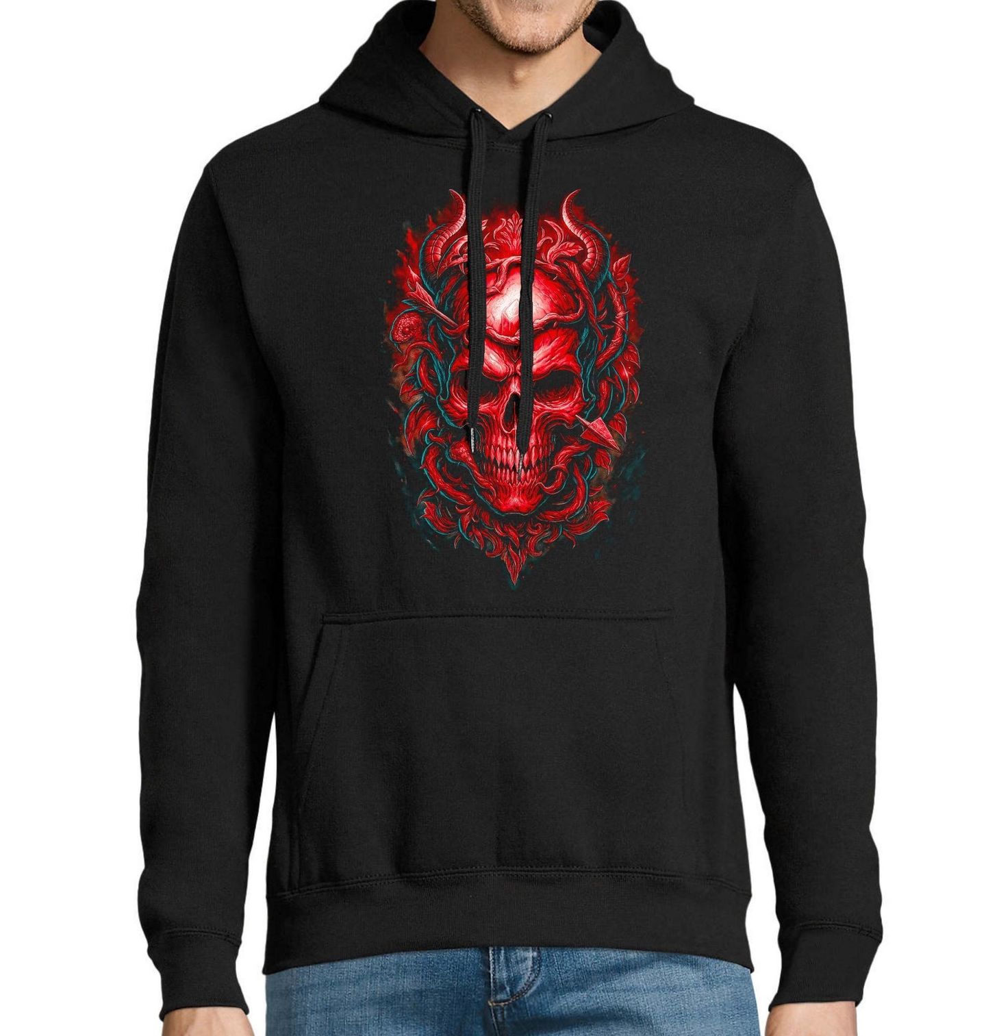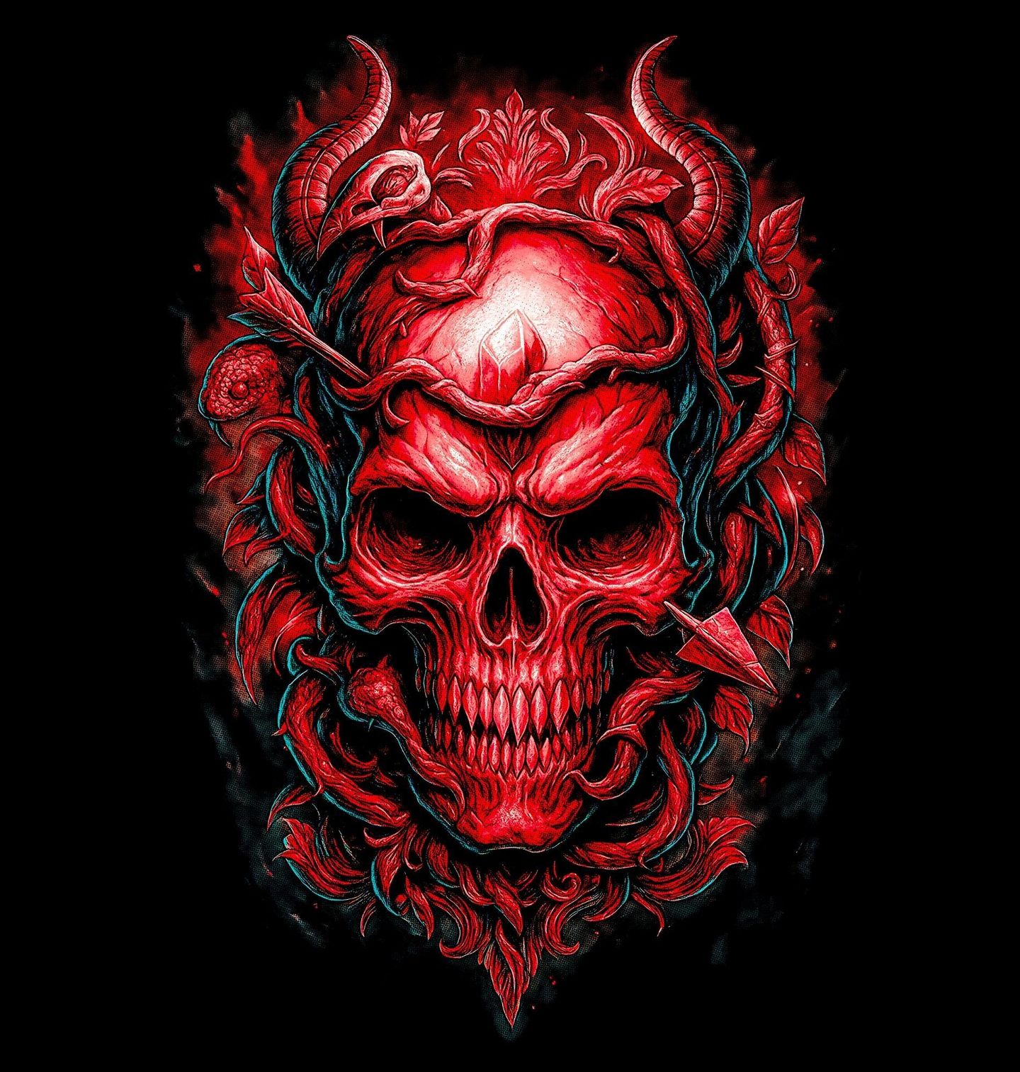 Pánská mikina Ďábelská Lebka. Výrazný a agresivní motiv, který okamžitě přitáhne pozornost. Dominantní lebka v temně rudém provedení působí jako zosobnění zla, kde se prolíná symbolika kostlivec a ďábel do jednoho silného vizuálního prvku. Detailní zpracování, ostré rysy a organické tvary vytvářejí dojem živé energie proudící z hlubin temnoty. Rudá barevnost dodává motivu intenzitu a dramatický náboj, který zaujme na první pohled.