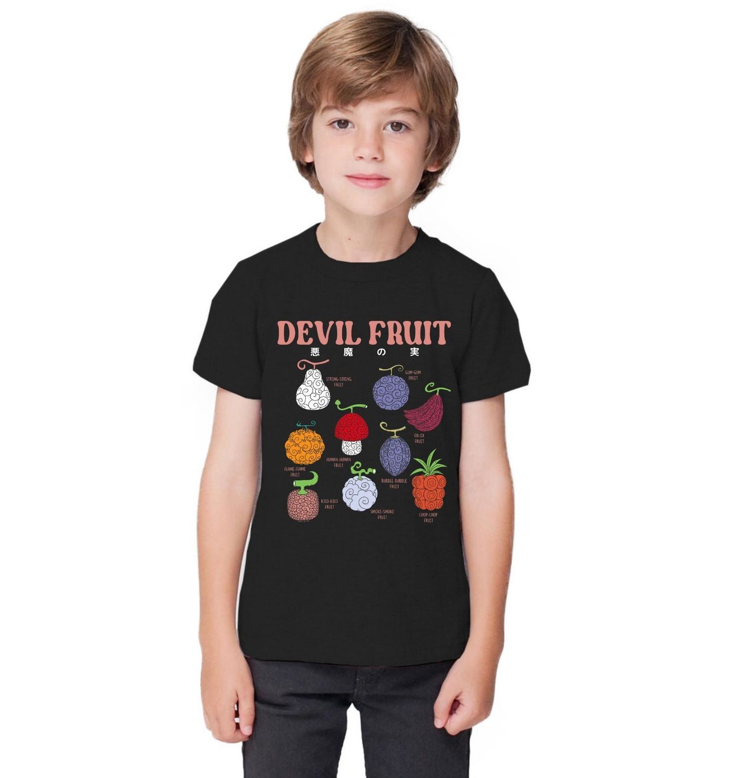Dětské tričko Ďábelské Plody Devil Fruits One Piece. Motiv inspirovaný světem anime One Piece, kde magické ovoce zvané Devil Fruit dává svým majitelům nadpřirozené schopnosti. Na motivu jsou stylizované ilustrace různých druhů ovoce a dokonce i houby, doplněné anglickými názvy, jako například: Gum-Gum, Flame-Flame , Smoke-Smoke, Human-Human Fruit, Bubble-Bubble Fruit.