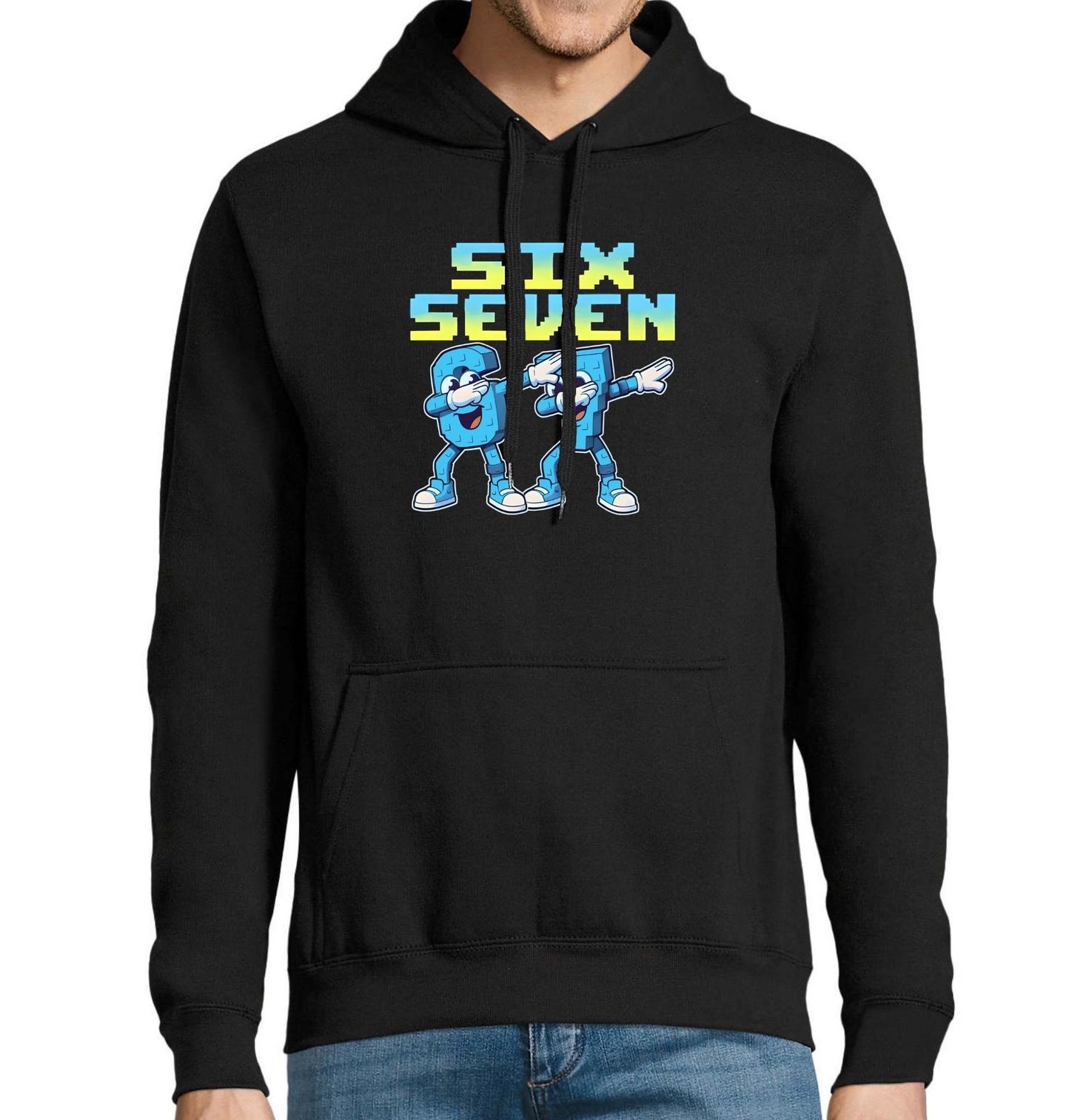 Pánská mikina Dabující Kámoši Šest Sedm 67 Six Seven. Stylový a vtipný motiv 67 six seven meme s modrými postavičkami čísel 6 a 7, které spolu dabují pod výrazným retro nápisem SIX SEVEN. Ideální pro každého, kdo miluje humor, internetové meme a chce originální design s číslem 67. Tenhle motiv prostě chytne pozornost na první pohled!