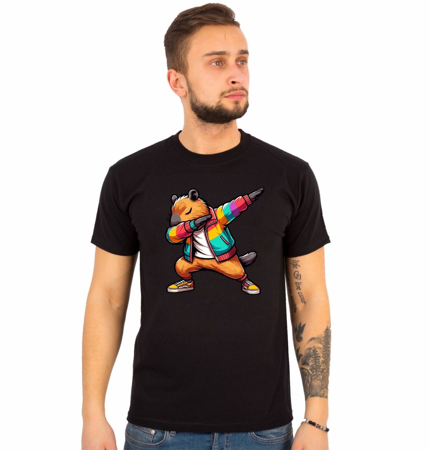 Pánské tričko Dabující Kapybara. Kapybara, která to má na háku! Tenhle dabující hlodavec v duhové bundě je přesně ten typ streetwear motivu, který si získá pozornost všude, kam přijdeš. Kapybara v tomhle kabátku má všechno – cool postoj, barevnost a energii. Ať už miluješ street fashion nebo zbožňuješ kapybary, tenhle motiv musíš mít ve sbírce.