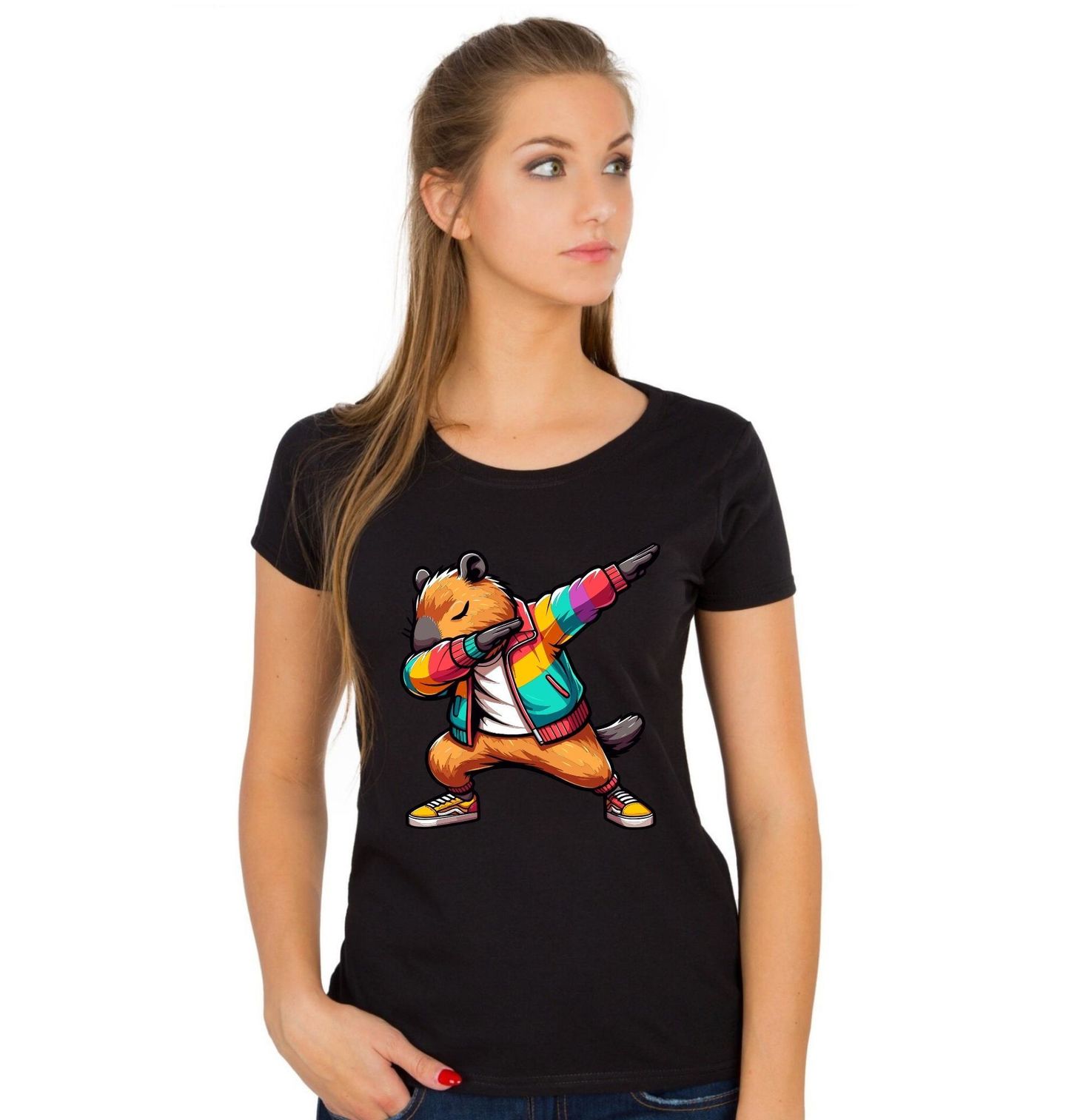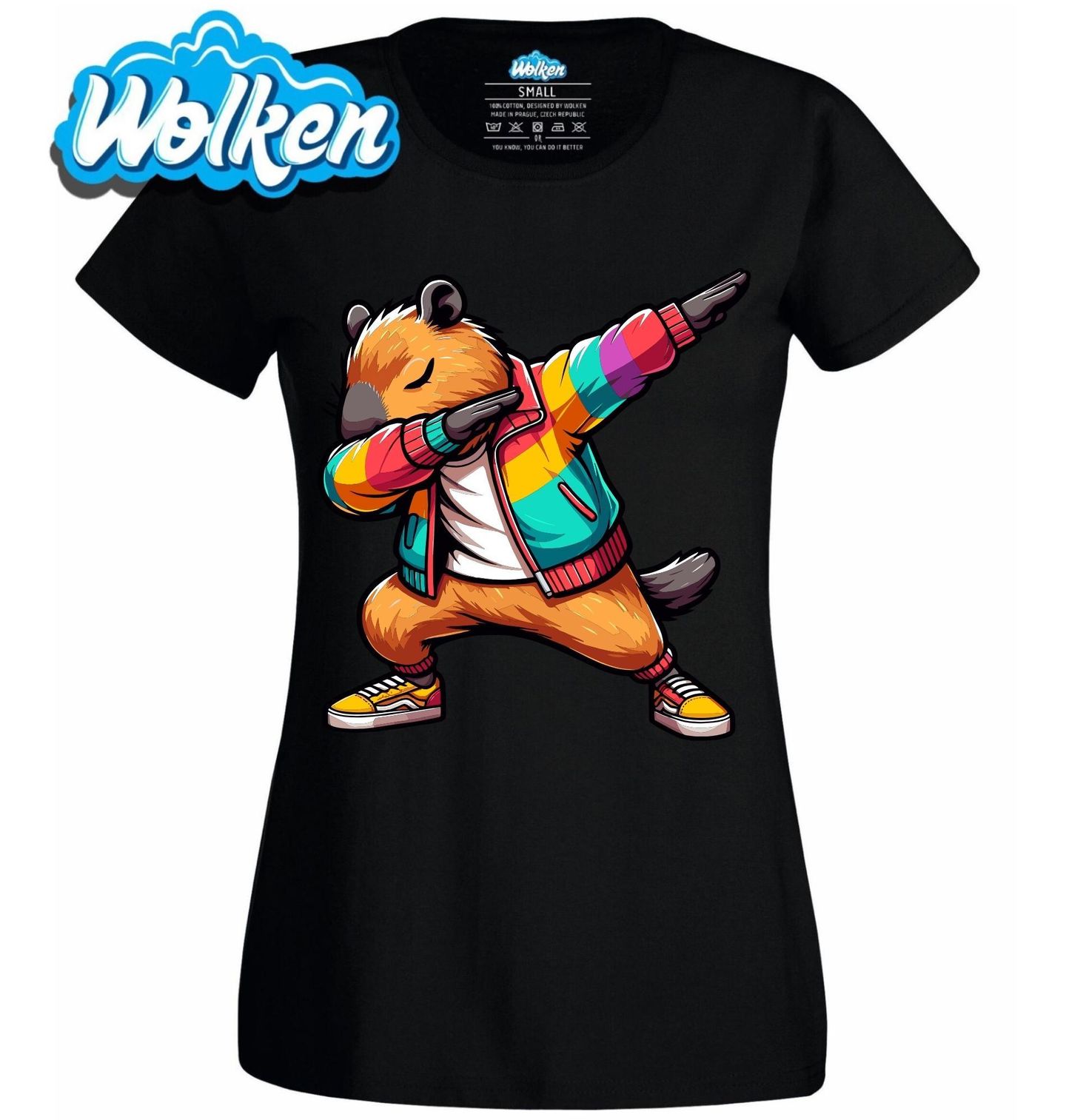 Dámské tričko Dabující Kapybara. Kapybara, která to má na háku! Tenhle dabující hlodavec v duhové bundě je přesně ten typ streetwear motivu, který si získá pozornost všude, kam přijdeš. Kapybara v tomhle kabátku má všechno – cool postoj, barevnost a energii. Ať už miluješ street fashion nebo zbožňuješ kapybary, tenhle motiv musíš mít ve sbírce.
