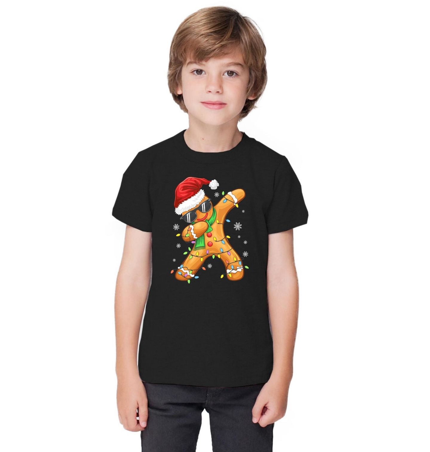 Dětské tričko Dabující Perníček v Brýlích. Vánoce ještě nikdy nebyly tak cool! Tento motiv spojuje tradiční symbol sladkých svátků s moderním tanečním stylem – dabující perníček v Santa čepici, obmotaný vánočními světýlky a s pořádně stylovými brýlemi.