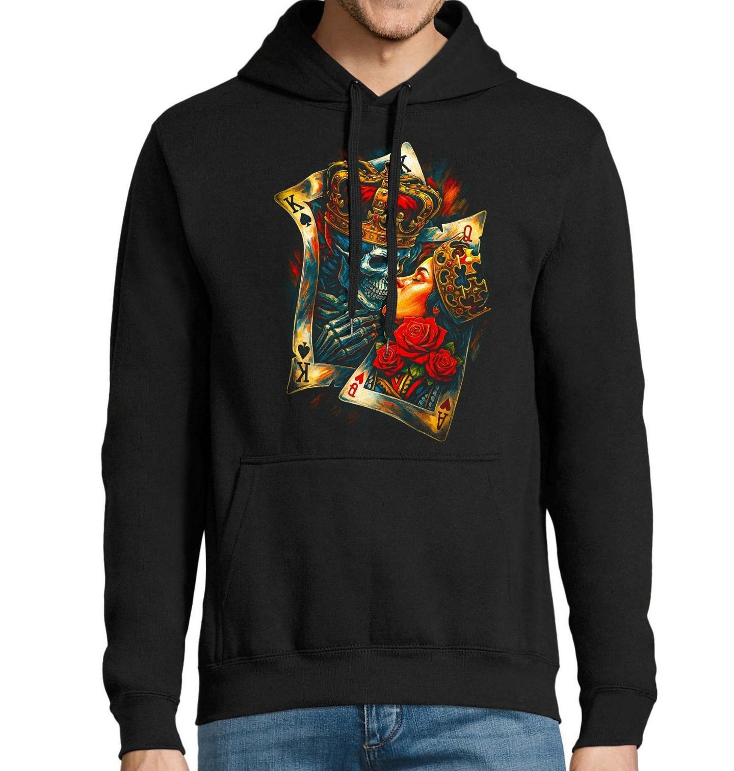 Pánská mikina Dáma Srdcová a Pikový Král. Temný a zároveň vášnivý motiv, kde se setkává král pikový a královna srdcová v podobě stylizovaných hrací karty, symbolizující lásku, která přetrvává i za hranicí života. Piková barva představuje smrt, sílu a temnotu, zatímco srdcová barva zosobňuje lásku, vášeň a emoce. Dominantní lebka krále kontrastuje s krásou královny a vytváří silný příběh o spojení dvou protikladů.