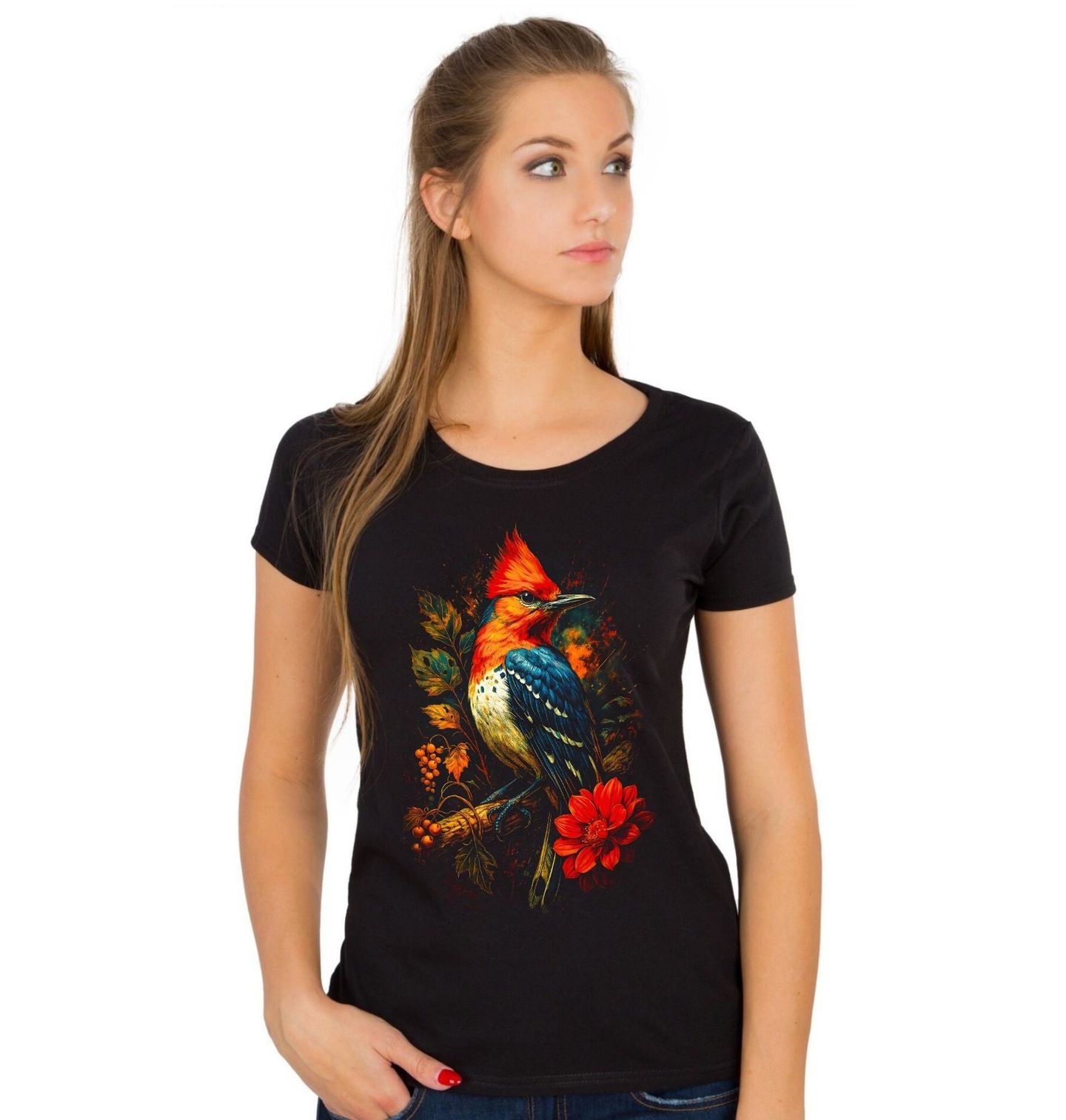 Dámské tričko Datel červenohlavý. Tento výrazný motiv zobrazuje pták s ohnivě červenou hlavou a kontrastním modročerným peřím v dynamickém, uměleckém pojetí. Zobrazeným druhem je datel červenohlavý, jeden z nejvýrazněji zbarvených datlů Severní Ameriky. Datel červenohlavý je symbolem vitality, vytrvalosti a spojení s lesní přírodou.