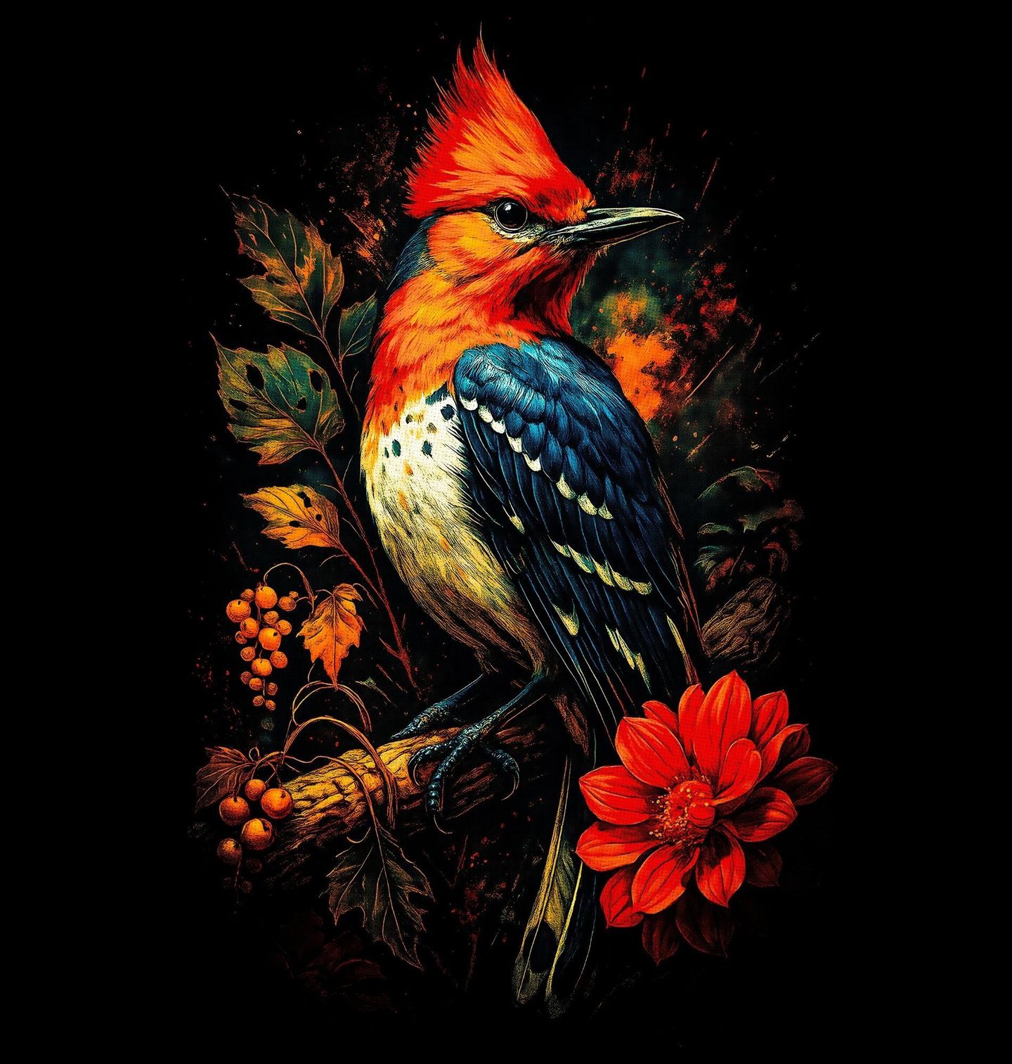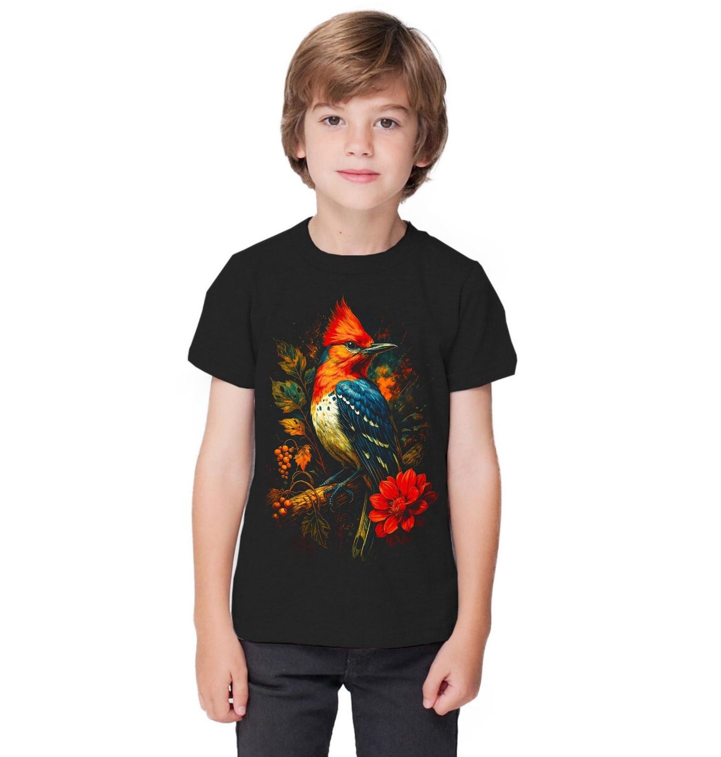 Dětské tričko Datel červenohlavý. Tento výrazný motiv zobrazuje pták s ohnivě červenou hlavou a kontrastním modročerným peřím v dynamickém, uměleckém pojetí. Zobrazeným druhem je datel červenohlavý, jeden z nejvýrazněji zbarvených datlů Severní Ameriky. Datel červenohlavý je symbolem vitality, vytrvalosti a spojení s lesní přírodou.